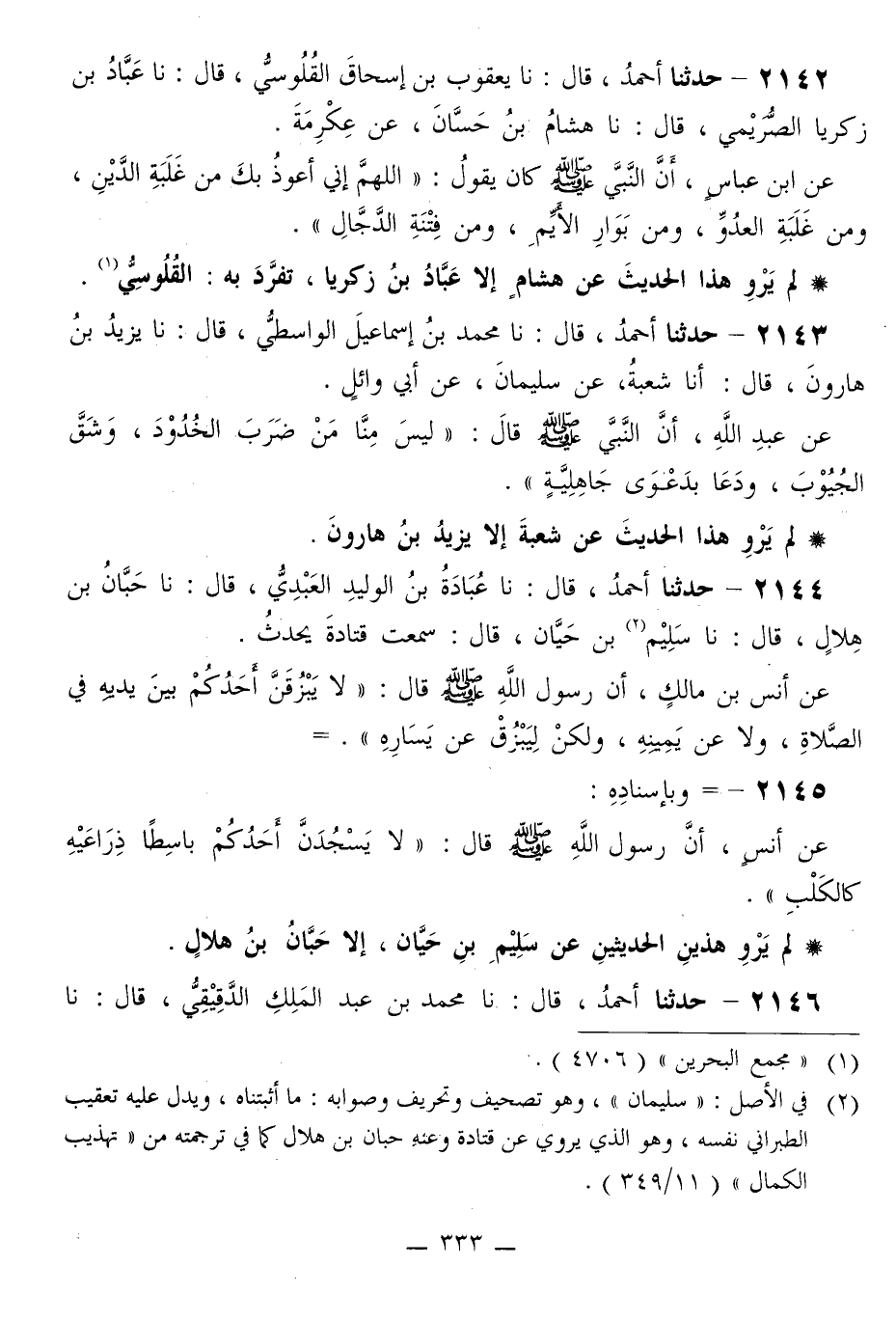2143 - حَدَّثَنَا أَحْمَدُ قَالَ: نا مُحَمَّدُ بْنُ إِسْمَاعِيلَ الْوَاسِطِيُّ قَالَ: نا يَزِيدُ بْنُ هَارُونَ قَالَ: أَنَا شُعْبَةُ، عَنْ سُلَيْمَانَ، عَنْ أَبِي وَائِلٍ، عَنْ عَبْدِ اللَّهِ، أَنَّ النَّبِيَّ صَلَّى اللهُ عَلَيْهِ وَسَلَّمَ قَالَ: «§لَيْسَ مِنَّا مَنْ ضَرَبَ الْخُدُودَ، وَشَقَّ الْجُيُوبَ، وَدَعَا بِدَعْوَى الْجَاهِلِيَّةِ»