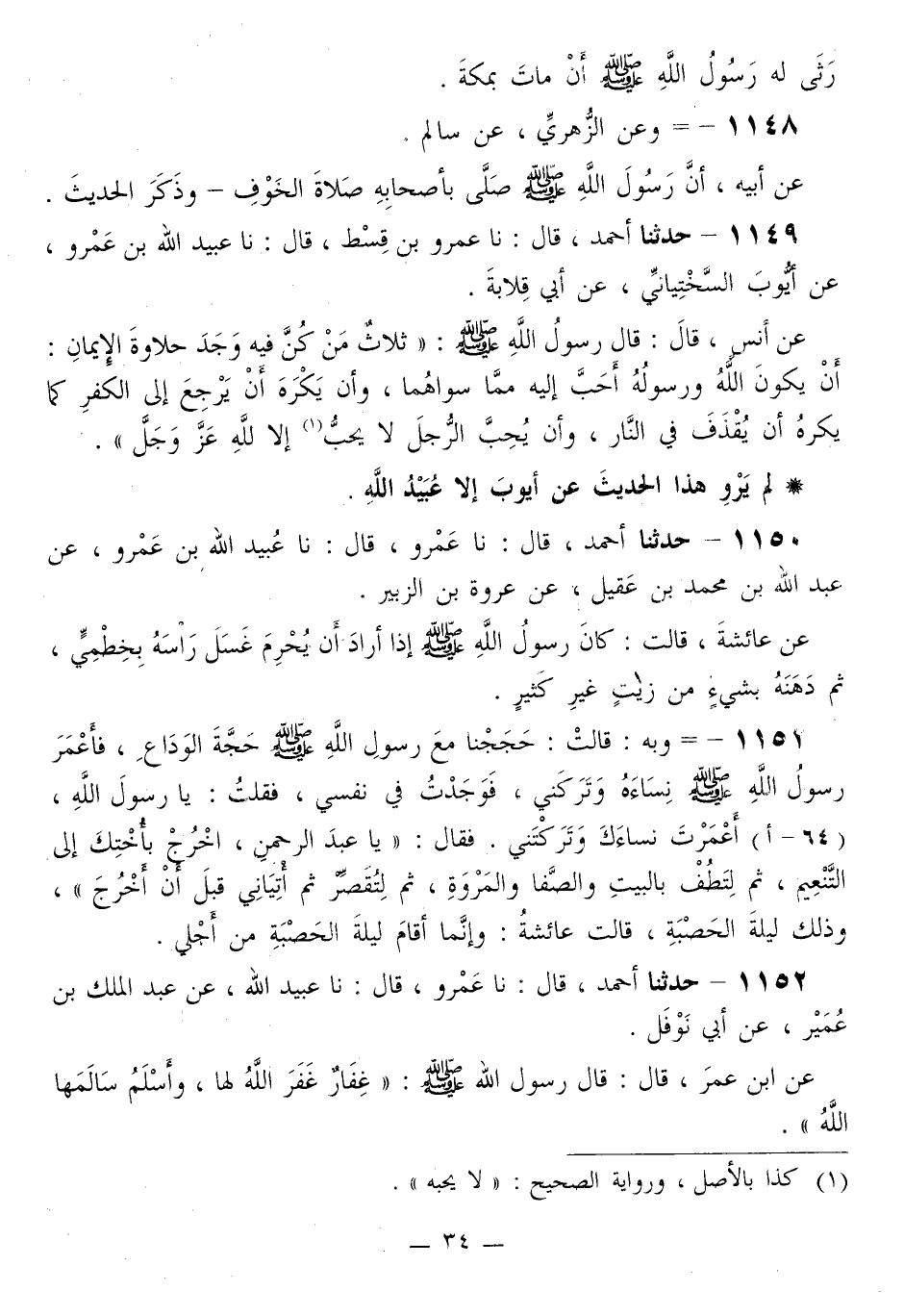 1149 - حَدَّثَنَا أَحْمَدُ قَالَ: نا عَمْرُو بْنُ قُسْطٍ قَالَ: نا عُبَيْدُ اللَّهِ بْنُ عَمْرٍو، عَنْ أَيُّوبَ السَّخْتِيَانِيِّ، عَنْ أَبِي قِلَابَةَ، عَنْ أَنَسٍ قَالَ: قَالَ رَسُولُ اللَّهِ صَلَّى اللهُ عَلَيْهِ وَسَلَّمَ: «§ثَلَاثٌ مَنْ كُنَّ فِيهِ وَجَدَ حَلَاوَةَ الْإِيمَانِ: أَنْ يَكُونَ اللَّهُ وَرَسُولُهُ أَحَبَّ إِلَيْهِ مِمَّا سِوَاهُمَا، وَأَنْ يَكْرَهَ أَنْ يَرْجِعَ إِلَى الْكُفْرِ كمَا يَكْرَهُ أَنْ يُقْذَفَ فِي النَّارِ، وَأَنْ يُحِبَّ الرَّجُلَ لَا يُحِبُّهُ إِلَّا لِلَّهِ عَزَّ وَجَلَّ»