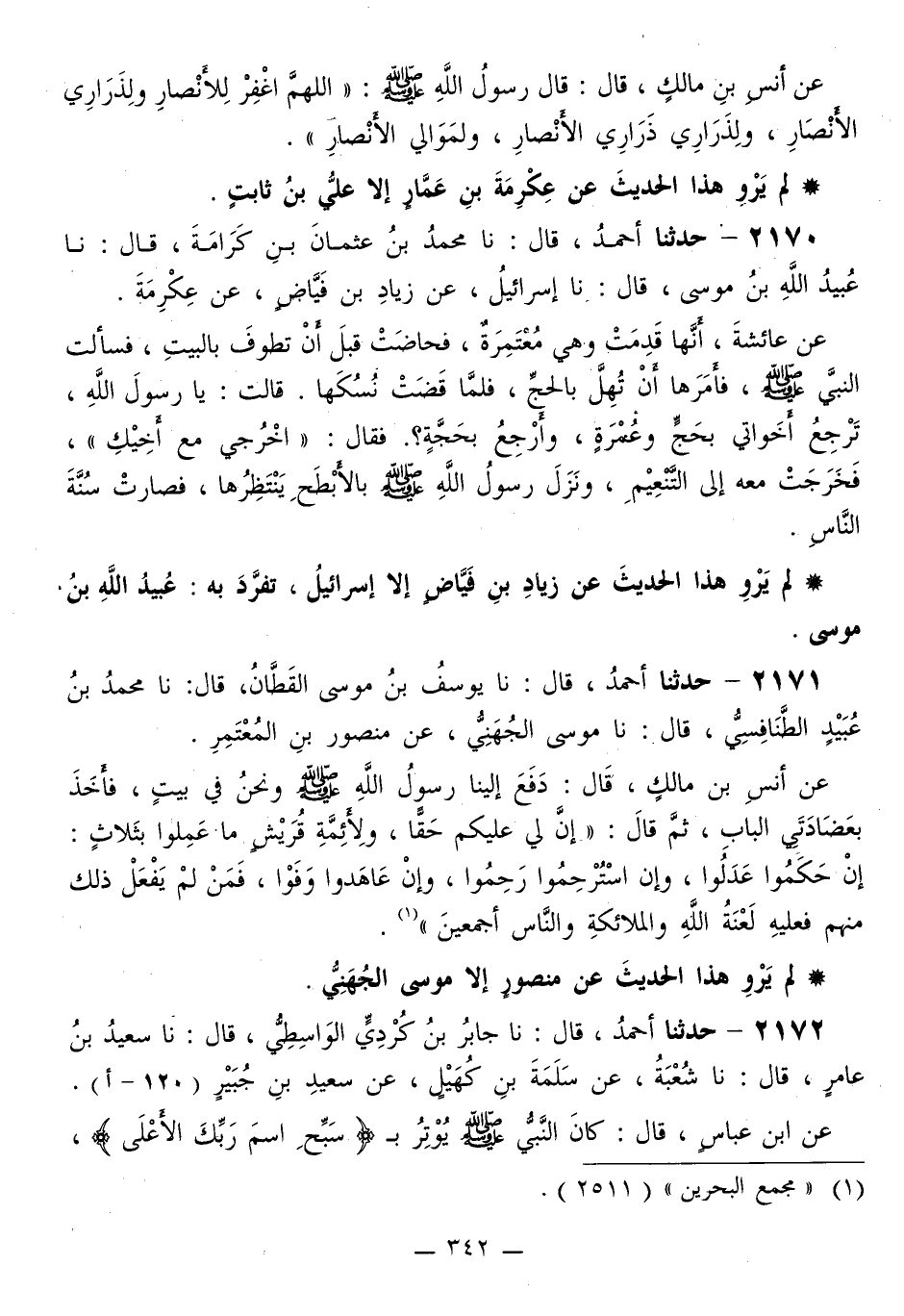 2171 - حَدَّثَنَا أَحْمَدُ قَالَ: نا يُوسُفُ بْنُ مُوسَى الْقَطَّانُ قَالَ: نا مُحَمَّدُ بْنُ عُبَيْدٍ الطَّنَافِسِيُّ قَالَ: نا مُوسَى الْجُهَنِيُّ، عَنْ مَنْصُورِ بْنِ الْمُعْتَمِرِ، عَنْ أَنَسِ بْنِ مَالِكٍ قَالَ: دَفَعَ إِلَيْنَا رَسُولُ اللَّهِ صَلَّى اللهُ عَلَيْهِ وَسَلَّمَ وَنَحْنُ فِي بَيْتٍ، فَأَخَذَ بِعِضَادَتَيِ الْبَابِ، ثُمَّ قَالَ: «إِنَّ §لِي عَلَيْكُمْ حَقًّا، وَلِأَئِمَّةِ قُرَيْشٍ مَا عَمِلُوا بِثَلَاثٍ: إِنْ حَكَمُوا عَدَلُوا، وَإِنِ اسْتُرْحِمُوا رَحِمُوا، وَإِنْ عَاهَدُوا وَفَوْا، فَمَنْ لَمْ يَفْعَلْ ذَلِكَ مِنْهُمْ فَعَلَيْهِ لَعْنَةُ اللَّهِ وَالْمَلَائِكَةِ وَالنَّاسِ أَجْمَعِينَ»