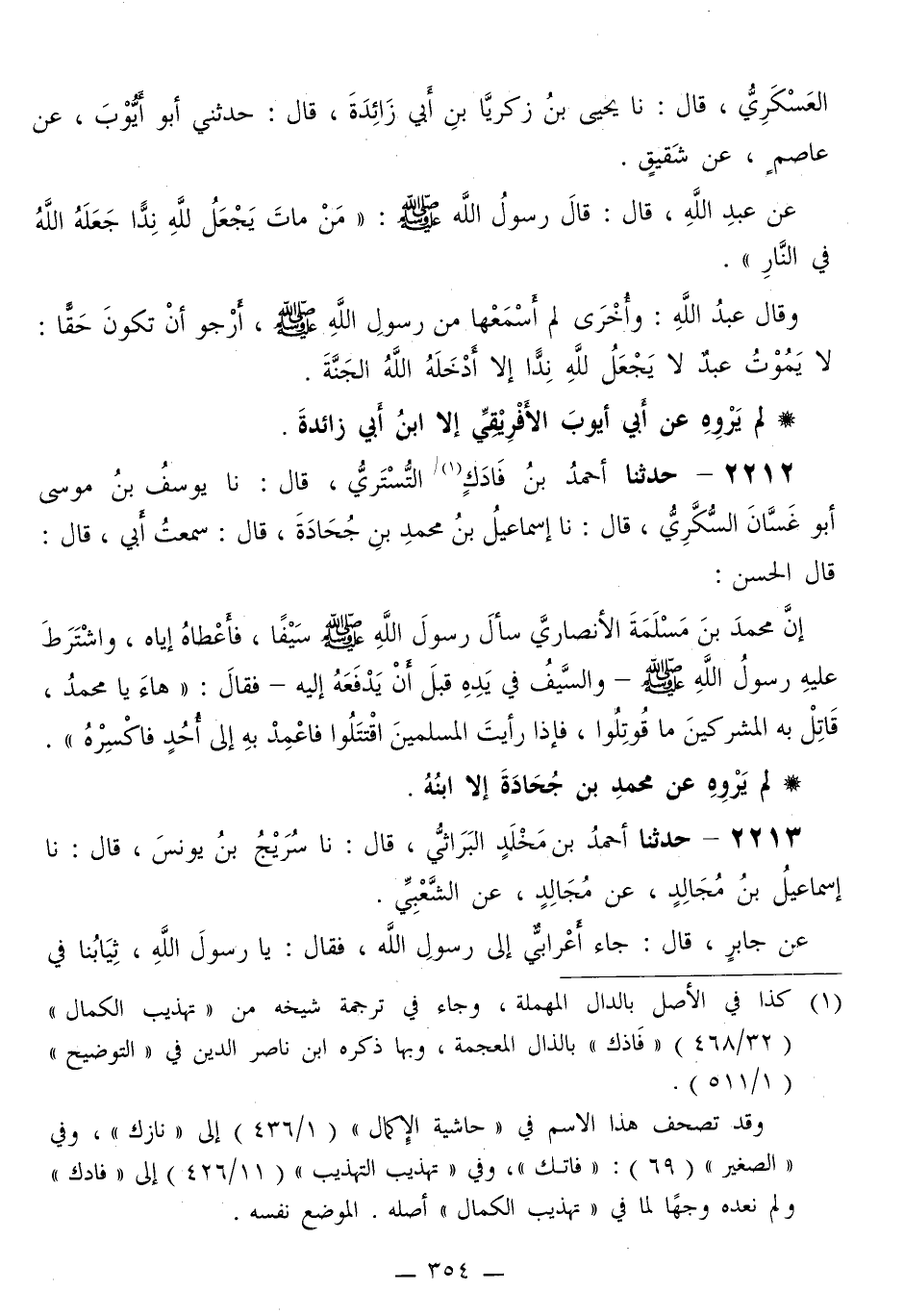 2212 - حَدَّثَنَا أَحْمَدُ بْنُ فَادِكٍ التُّسْتَرِيُّ قَالَ: نا يُوسُفُ بْنُ مُوسَى أَبُو غَسَّانَ السُّكَّرِيُّ قَالَ: نا إِسْمَاعِيلُ بْنُ مُحَمَّدِ بْنِ جُحَادَةَ قَالَ: سَمِعْتُ أَبِي قَالَ: قَالَ الْحَسَنُ: إِنَّ مُحَمَّدَ بْنَ مَسْلَمَةَ الْأَنْصَارِيَّ سَأَلَ رَسُولَ اللَّهِ صَلَّى اللهُ عَلَيْهِ وَسَلَّمَ سَيْفًا، فَأَعْطَاهُ إِيَّاهُ، وَاشْتَرَطَ عَلَيْهِ رَسُولُ اللَّهِ صَلَّى اللهُ عَلَيْهِ وَسَلَّمَ وَالسَّيْفُ فِي يَدِهِ قَبْلَ أَنْ يَدْفَعَهُ إِلَيْهِ، فَقَالَ: «هَاءَ يَا مُحَمَّدُ، §قَاتِلْ بِهِ الْمُشْرِكِينَ مَا قُوتِلُوا، فَإِذَا رَأَيْتَ الْمُسْلِمِينَ اقْتَتَلُوا فَاعْمَدْ بِهِ إِلَى أُحُدٍ فَاكْسِرْهُ»