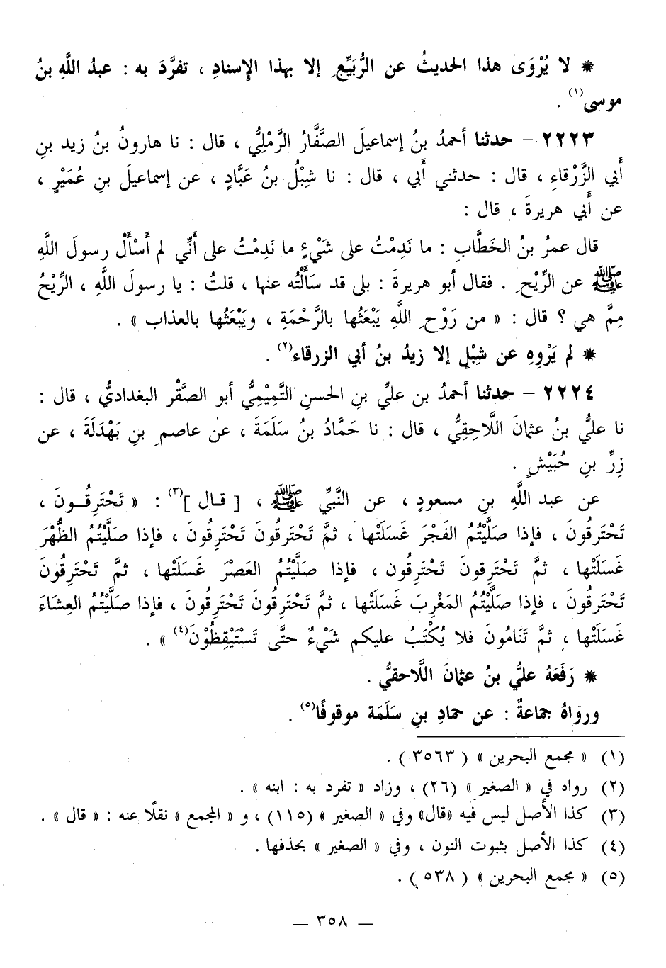 2223 - حَدَّثَنَا أَحْمَدُ بْنُ إِسْمَاعِيلَ الصَّفَارُ الرَّمْلِيُّ قَالَ: نا هَارُونُ بْنُ زَيْدِ بْنِ أَبِي الزَّرْقَاءِ قَالَ: حَدَّثَنِي أَبِي قَالَ: نا شِبْلُ بْنُ عَبَّادٍ، عَنْ إِسْمَاعِيلَ بْنِ عُمَيْرٍ، عَنْ أَبِي هُرَيْرَةَ قَالَ: قَالَ عُمَرُ بْنُ الْخَطَّابِ: مَا نَدِمْتُ عَلَى شَيْءٍ مَا نَدِمْتُ عَلَى أَنِّي لَمْ أَسْأَلْ رَسُولَ اللَّهِ صَلَّى اللهُ عَلَيْهِ وَسَلَّمَ عَنِ الرِّيحِ. فَقَالَ أَبُو هُرَيْرَةَ: بَلَى قَدْ سَأَلْتُهُ عَنْهَا، قُلْتُ: يَا رَسُولَ اللَّهِ، الرِّيحُ مِمَّ هِيَ؟ قَالَ: «§مِنْ رَوْحِ اللَّهِ يَبْعَثُهَا بِالرَّحْمَةِ، وَيَبْعَثُهَا بِالْعَذَابِ»