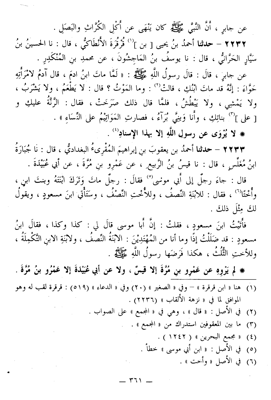 2233 - حَدَّثَنَا أَحْمَدُ بْنُ يَعْقُوبَ بْنِ إِبْرَاهِيمَ الْمُقْرِئُ الْبَغْدَادِيُّ قَالَ: نا جُبَارَةُ بْنُ مُغَلِّسٍ قَالَ: نا قَيْسُ بْنُ الرَّبِيعِ، عَنْ عَمْرِو بْنِ مُرَّةَ، عَنْ أَبِي عُبَيْدَةَ قَالَ: جَاءَ رَجُلٌ إِلَى أَبِي مُوسَى فَقَالَ: رَجُلٌ مَاتَ وَتَرَكَ ابْنَتَهُ وَبِنْتَ ابْنٍ، وَأُخْتًا، فَقَالَ: لِلِابْنَةِ النِّصْفُ، وَلِلْأُخْتِ النِّصْفُ، وَسَتَأْتِي ابْنَ مَسْعُودٍ، وَيَقُولُ لَكَ مِثْلَ ذَلِكَ. فَأَتَيْتُ ابْنَ مَسْعُودٍ، فَقُلْتُ: إِنَّ أَبَا مُوسَى قَالَ لِي: كَذَا وَكَذَا، فَقَالَ ابْنُ مَسْعُودٍ: قَدْ ضَلَلْتُ إِذًا وَمَا أَنَا مِنَ الْمُهْتَدِينَ: «§الِابْنَةُ النِّصْفُ، وَلِابْنَةِ الِابْنِ التَّكْمِلَةُ، وَلِلْأُخْتِ الثُّلُثُ، هَكَذَا فَرَضَهَا رَسُولُ اللَّهِ صَلَّى اللهُ عَلَيْهِ وَسَلَّمَ»