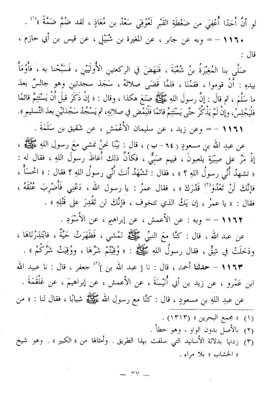 1161 - وَعَنْ زَيْدٍ، عَنْ سُلَيْمَانَ الْأَعْمَشِ، عَنْ شَقِيقِ بْنِ سَلَمَةَ، عَنْ عَبْدِ اللَّهِ بْنِ مَسْعُودٍ قَالَ: بَيْنَا نَحْنُ نَمْشِي مَعَ رَسُولِ اللَّهِ صَلَّى اللهُ عَلَيْهِ وَسَلَّمَ، إِذْ مَرَّ عَلَى صِبْيَةٍ يَلْعَبُونَ، فِيهِمْ صَبِيٌّ، فَكَأَنَّ ذَلِكَ أَغَاظَ رَسُولَ اللَّهِ فَقَالَ لَهُ: «§تَشْهَدُ أَنِّي رَسُولُ اللَّهِ؟» فَقَالَ: تَشْهَدُ أَنْتَ أَنِّي رَسُولُ اللَّهِ؟ فَقَالَ: «اخْسَأْ، فَإِنَّكَ لَنْ تَعْدُوَ قَدْرَكَ» فَقَالَ عُمَرُ: يَا رَسُولَ اللَّهِ، دَعْنِي فَأَضْرِبَ عُنُقَهُ، فَقَالَ: «يَا عُمَرُ، إِنْ يَكُ الَّذِي تَتَخَوَّفُ، فَإِنَّكَ لَنْ تَقْدِرَ عَلَى قَتْلِهِ»