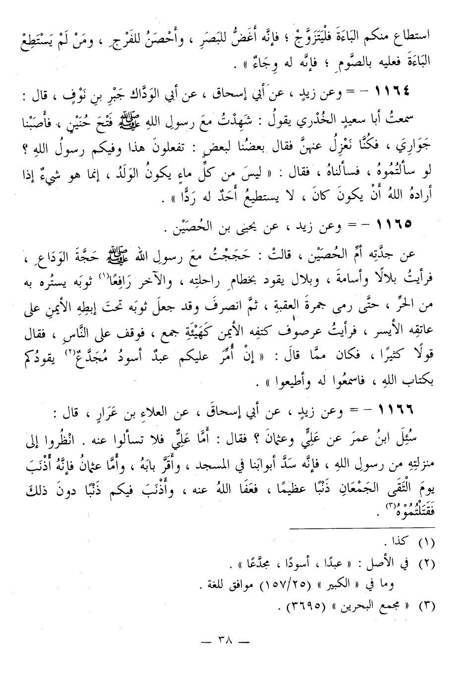 1165 - وَعَنْ زَيْدٍ، عَنْ يَحْيَى بْنِ الْحُصَيْنِ، عَنْ جَدَّتِهِ أُمِّ الْحُصَيْنِ، قَالَتْ: حَجَجْتُ مَعَ رَسُولِ اللَّهِ صَلَّى اللهُ عَلَيْهِ وَسَلَّمَ حَجَّةَ الْوَدَاعِ، فَرَأَيْتُ بِلَالًا وَأُسَامَةَ، وَبِلَالٌ يَقُودُ بِخِطَامِ رَاحِلَتِهِ، وَالْآخَرُ رَافِعٌ ثَوْبَهُ يَسْتُرُهُ بِهِ مِنَ الْحَرِّ، حَتَّى رَمَى جَمْرَةَ الْعَقَبَةِ، ثُمَّ انْصَرَفَ وَقَدْ جَعَلَ ثَوْبَهُ تَحْتَ إِبْطِهِ الْأَيْمَنِ عَلَى عَاتِقِهِ الْأَيْسَرِ، فَرَأَيْتُ عُرْصُوفَ كَتِفِهِ الْأَيْمَنِ كَهَيْئَةِ جَمْعٍ، فَوَقَفَ عَلَى النَّاسِ، فَقَالَ قَوْلًا كَثِيرًا، فَكَانَ مِمَّا قَالَ: «§إِنْ أُمِّرَ عَلَيْكُمْ عَبْدٌ أَسْوَدٌ مُجَدَّعٌ يَقُودُكُمْ بِكِتَابِ اللَّهِ، فَاسْمَعُوا لَهُ وَأَطِيعُوا»