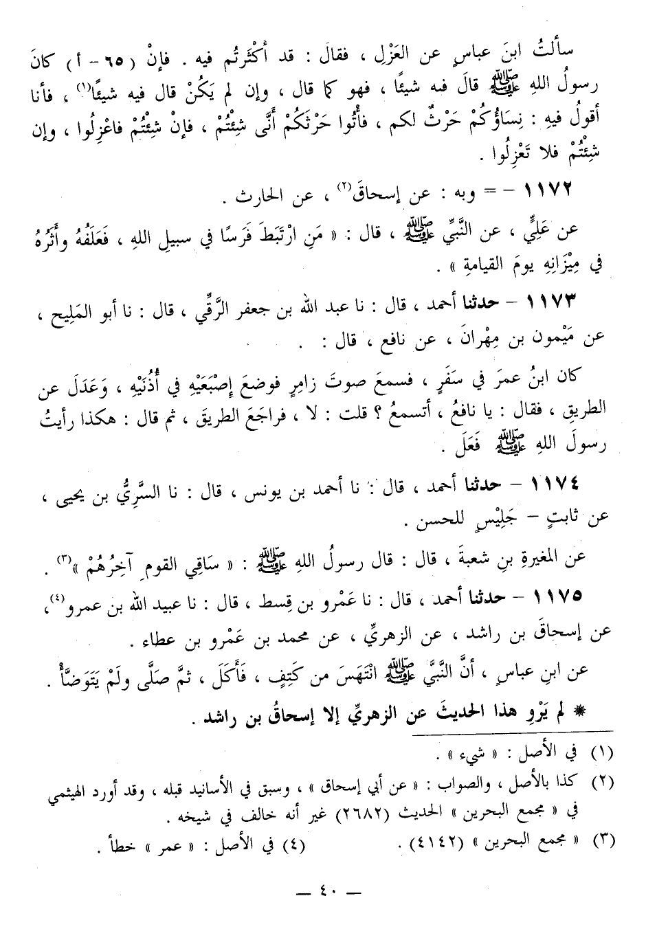 1173 - حَدَّثَنَا أَحْمَدُ قَالَ: نا عَبْدُ اللَّهِ بْنُ جَعْفَرٍ الرَّقِّيُّ قَالَ: نا أَبُو الْمَلِيحِ، عَنْ مَيْمُونِ بْنِ مِهْرَانَ، عَنْ نَافِعٍ قَالَ: كَانَ ابْنُ عُمَرَ فِي سَفَرٍ، §فَسَمِعَ صَوْتَ، زَامِرٍ فَوَضَعَ إِصْبَعَيْهِ فِي أُذُنَيْهِ، وَعَدَلَ عَنِ الطَّرِيقِ، فَقَالَ: يَا نَافِعُ، أَتَسْمَعُ؟ قُلْتُ: لَا، فَرَاجَعَ الطَّرِيقَ، ثُمَّ قَالَ: «هَكَذَا رَأَيْتُ رَسُولَ اللَّهِ صَلَّى اللهُ عَلَيْهِ وَسَلَّمَ فَعَلَ»