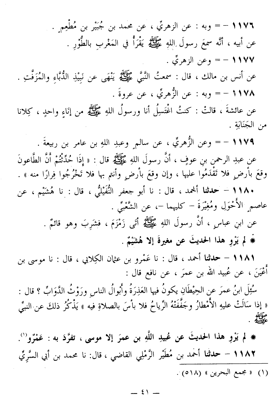 1179 - وَعَنِ الزُّهْرِيِّ، عَنْ سَالِمٍ، وَعَبْدِ اللَّهِ بْنِ عَامِرِ بْنِ رَبِيعَةَ، عَنْ عَبْدِ الرَّحْمَنِ بْنِ عَوْفٍ، أَنَّ رَسُولَ اللَّهِ صَلَّى اللهُ عَلَيْهِ وَسَلَّمَ قَالَ: «§إِذَا حُدِّثْتُمْ أَنَّ الطَّاعُونَ وَقَعَ بِأَرْضٍ فَلَا تَقْدَمُوا عَلَيْهَا، وَإِنْ وَقَعَ بِأَرْضٍ وَأَنْتُمْ بِهَا فَلَا تَخْرُجُوا فِرَارًا مِنْهُ»