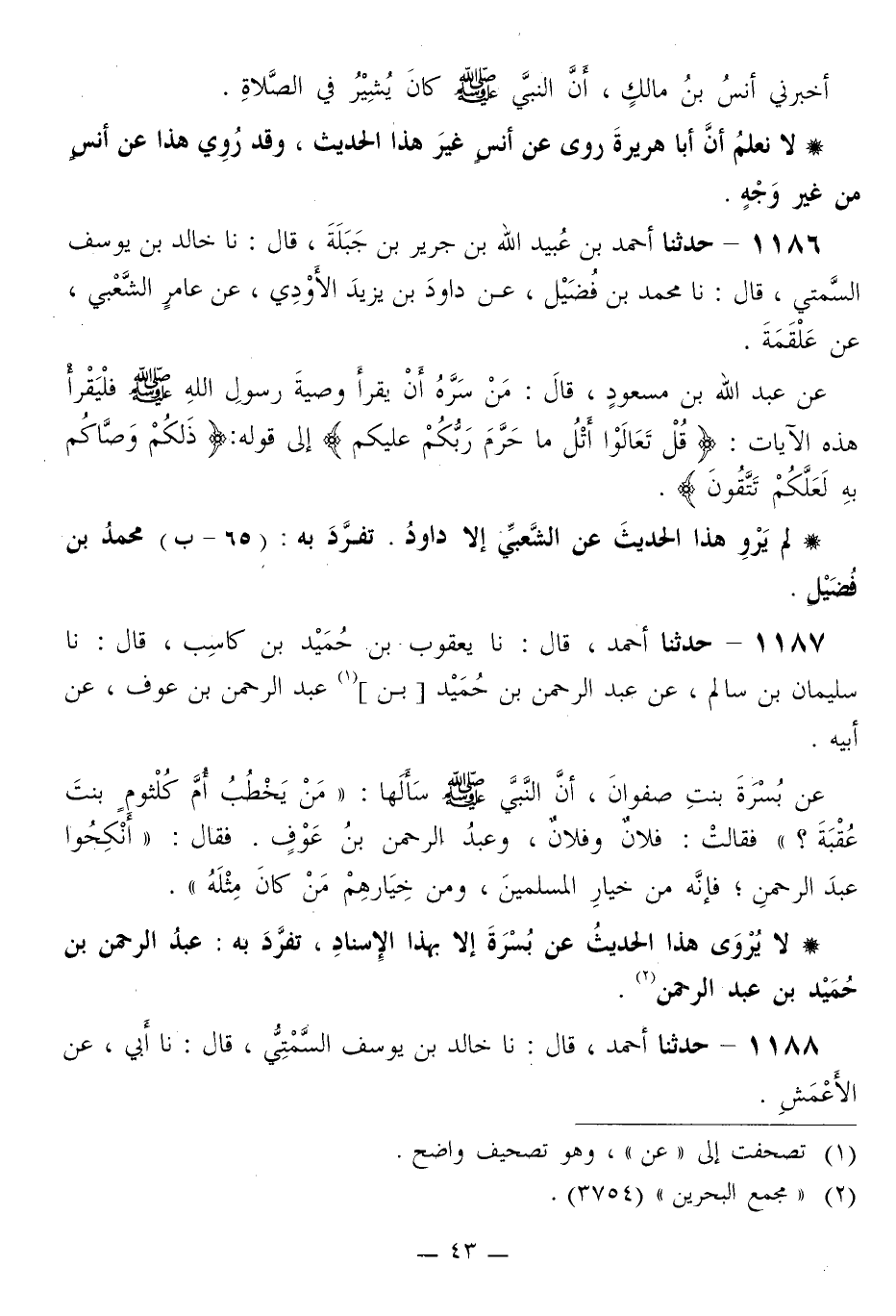 1187 - حَدَّثَنَا أَحْمَدُ قَالَ: نا يَعْقُوبُ بْنُ حُمَيْدِ بْنِ كَاسِبٍ قَالَ: نا سُلَيْمَانُ بْنُ سَالِمٍ، عَنْ عَبْدِ الرَّحْمَنِ بْنِ حُمَيْدِ بْنِ عَبْدِ الرَّحْمَنِ بْنِ عَوْفٍ، عَنْ أَبِيهِ، عَنْ بُسْرَةَ بِنْتِ صَفْوَانَ، أَنَّ النَّبِيَّ صَلَّى اللهُ عَلَيْهِ وَسَلَّمَ سَأَلَهَا: «مَنْ يَخْطُبُ أُمَّ كُلْثُومِ بِنْتِ عُقْبَةَ؟» فَقَالَتْ: فُلَانٌ وَفُلَانٌ، وَعَبْدُ الرَّحْمَنِ بْنُ عَوْفٍ. فَقَالَ: «§أَنْكِحُوا عَبْدَ الرَّحْمَنِ، فَإِنَّهُ مِنْ خِيَارِ الْمُسْلِمِينَ، وَمِنْ خِيَارِهِمْ مَنْ كَانَ مِثْلَهُ»