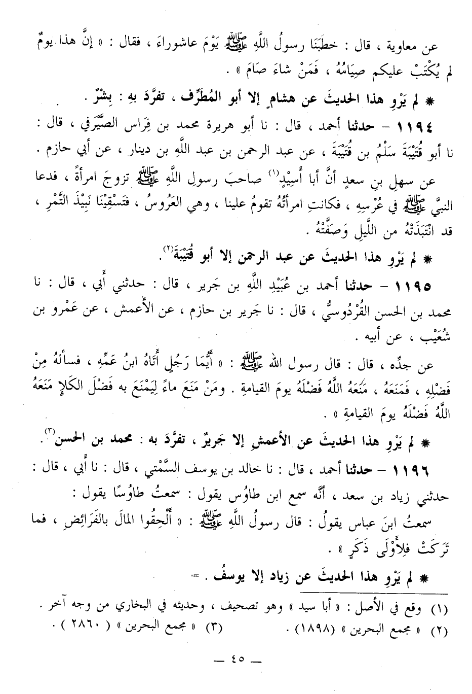 1194 - حَدَّثَنَا أَحْمَدُ قَالَ: نا أَبُو هُرَيْرَةَ مُحَمَّدُ بْنُ فِرَاسٍ الصَّيْرَفِيُّ قَالَ: نا أَبُو قُتَيْبَةَ سَلْمُ بْنُ قُتَيْبَةَ، عَنْ عَبْدِ الرَّحْمَنِ بْنِ عَبْدِ اللَّهِ بْنِ دِينَارٍ، عَنْ أَبِي حَازِمٍ، عَنْ سَهْلِ بْنِ سَعْدٍ، «أَنَّ أَبَا أُسَيْدٍ، صَاحِبَ رَسُولِ اللَّهِ صَلَّى اللهُ عَلَيْهِ وَسَلَّمَ تَزَوَّجَ امْرَأَةً،» فَدَعَا النَّبِيَّ صَلَّى اللهُ عَلَيْهِ وَسَلَّمَ فِي عُرْسِهِ «، فَكَانَتِ امْرَأَتُهُ تَقُومُ عَلَيْنَا، وَهِيَ الْعَرُوسُ، §فَتَسْقِينَا نَبِيذَ التَّمْرِ، قَدِ انْتَبَذَتْهُ مِنَ اللَّيْلِ وَصَفَّتْهُ»