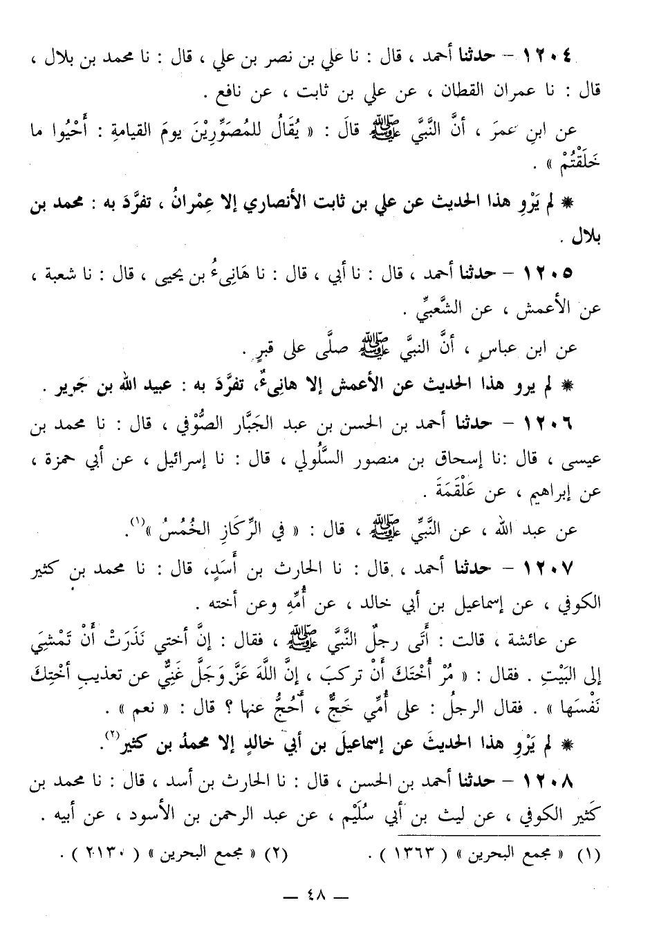 1204 - حَدَّثَنَا أَحْمَدُ قَالَ: نا عَلِيُّ بْنُ نَصْرِ بْنِ عَلِيٍّ قَالَ: نا مُحَمَّدُ بْنُ بِلَالٍ قَالَ: نا عِمْرَانُ الْقَطَّانُ، عَنْ عَلِيِّ بْنِ ثَابِتٍ، عَنْ نَافِعٍ، عَنِ ابْنِ عُمَرَ، أَنَّ النَّبِيَّ صَلَّى اللهُ عَلَيْهِ وَسَلَّمَ قَالَ: «§يُقَالُ لِلْمُصَوِّرِينَ يَوْمَ الْقِيَامَةِ: أَحْيُوا مَا خَلَقْتُمْ»