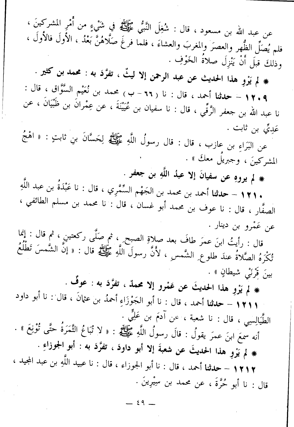 1209 - حَدَّثَنَا أَحْمَدُ قَالَ: نا مُحَمَّدُ بْنُ نُعَيْمٍ السَّوَّاقُ قَالَ: نا عَبْدُ اللَّهِ بْنُ جَعْفَرٍ الرَّقِّيُّ قَالَ: نا سُفْيَانُ بْنُ عُيَيْنَةَ، عَنْ عِمْرَانَ بْنِ ظَبْيَانَ، عَنْ عَدِيِّ بْنِ ثَابِتٍ، عَنِ الْبَرَاءِ بْنِ عَازِبٍ قَالَ: قَالَ رَسُولُ اللَّهِ صَلَّى اللهُ عَلَيْهِ وَسَلَّمَ لِحَسَّانَ بْنِ ثَابِتٍ: «§اهْجُ الْمُشْرِكِينَ وَجِبْرِيلُ مَعَكَ»