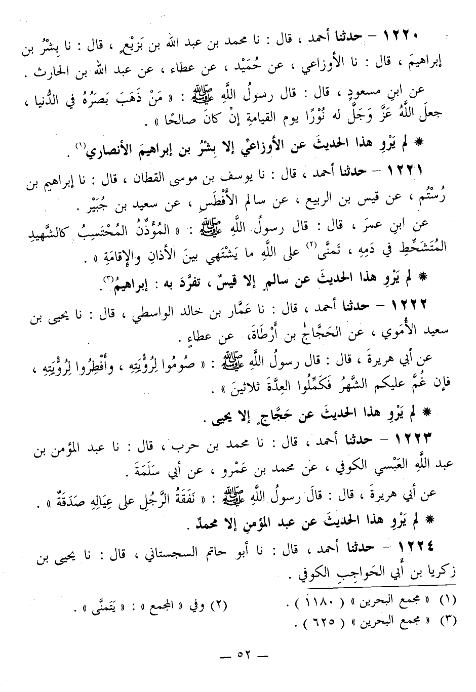 1224 - حَدَّثَنَا أَحْمَدُ قَالَ: نا أَبُو حَاتِمٍ السِّجِسْتَانِيُّ قَالَ: نا يَحْيَى بْنُ زَكَرِيَّا بْنِ أَبِي الْحَوَاجِبِ الْكُوفِيُّ قَالَ: -[53]- كُنْتُ آخِذًا بِيَدِ الْأَعْمَشِ، فَقَالَ: «قَرَأْتُ الْقُرْآنَ عَلَى يَحْيَى بْنِ وَثَّابٍ، §ثَلَاثِينَ مُرَّةً كُلُّ ذَلِكَ أَقْرَأُ: {وَالرِّجْزَ} [المدثر: 5] » ، وَكَذَلِكَ قَرَأَ يَحْيَى عَلَى عَلْقَمَةَ، وعَلْقَمَةُ عَلَى ابْنِ مَسْعُودٍ، وَابْنُ مَسْعُودٍ عَلَى النَّبِيِّ صَلَّى اللهُ عَلَيْهِ وَسَلَّمَ «