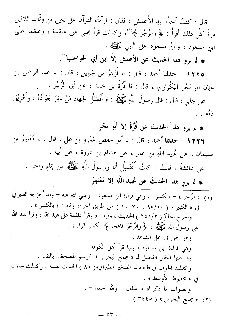 1225 - حَدَّثَنَا أَحْمَدُ قَالَ: نا أَزْهَرُ بْنُ جَمِيلٍ قَالَ: نا عَبْدُ الرَّحْمَنِ بْنُ عُثْمَانَ أَبُو بَحْرٍ الْبَكْرَاوِيُّ قَالَ: نا قُرَّةُ بْنُ خَالِدٍ، عَنْ أَبِي الزُّبَيْرِ، عَنْ جَابِرٍ قَالَ: قَالَ رَسُولُ اللَّهِ صَلَّى اللهُ عَلَيْهِ وَسَلَّمَ: «§أَفْضَلُ الْجِهَادِ مَنْ عُقِرَ جَوَادُهُ، وَأُهْرِيقَ دَمُهُ»