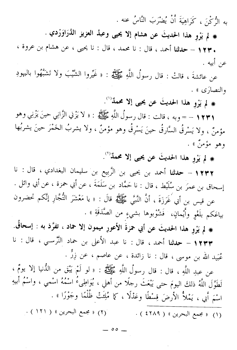 1230 - حَدَّثَنَا أَحْمَدُ قَالَ: نا مُحَمَّدُ قَالَ: نا يَحْيَى، عَنْ هِشَامِ بْنِ عُرْوَةَ، عَنْ أَبِيهِ، عَنْ عَائِشَةَ قَالَتْ: قَالَ رَسُولُ اللَّهِ صَلَّى اللهُ عَلَيْهِ وَسَلَّمَ: «§غَيِّرُوا الشَّيْبَ وَلَا تَشَبَّهُوا بِالْيَهُودِ وَالنَّصَارَى»