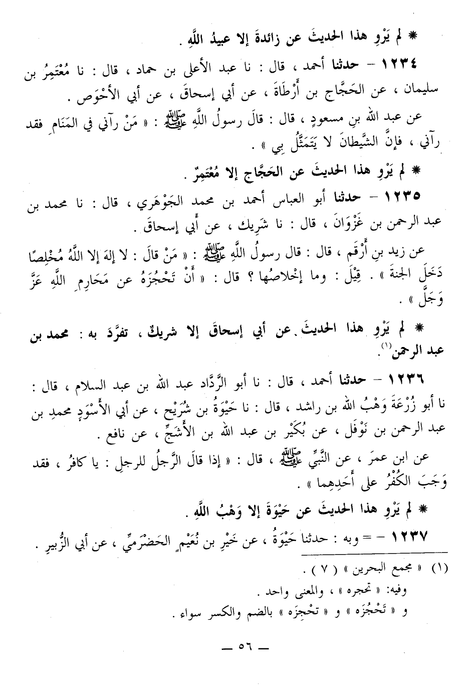 1234 - حَدَّثَنَا أَحْمَدُ قَالَ: نا عَبْدُ الْأَعْلَى بْنُ حَمَّادٍ قَالَ: نا مُعْتَمِرُ بْنُ سُلَيْمَانَ، عَنِ الْحَجَّاجِ بْنِ أَرْطَاةَ، عَنْ أَبِي إِسْحَاقَ، عَنْ أَبِي الْأَحْوَصِ، عَنْ عَبْدِ اللَّهِ بْنِ مَسْعُودٍ قَالَ: قَالَ رَسُولُ اللَّهِ صَلَّى اللهُ عَلَيْهِ وَسَلَّمَ: «§مَنْ رَآنِي فِي الْمَنَامِ فَقَدْ رَآنِي، فَإِنَّ الشَّيْطَانَ لَا يَتَمَثَّلُ بِي»