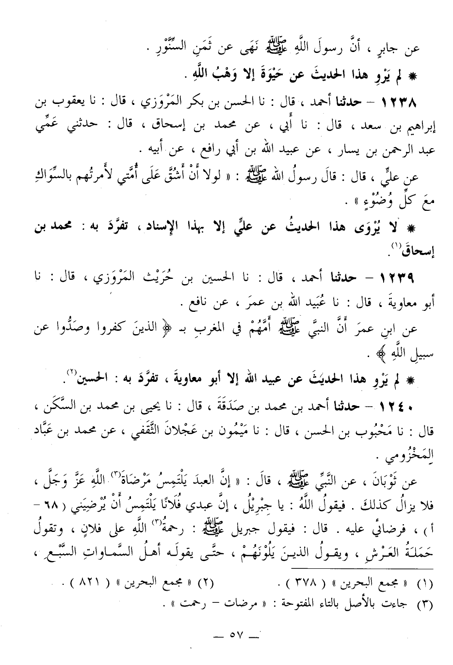 1238 - حَدَّثَنَا أَحْمَدُ قَالَ: نا الْحَسَنُ بْنُ بَكْرٍ الْمَرْوَزِيُّ قَالَ: نا يَعْقُوبُ بْنُ إِبْرَاهِيمَ بْنِ سَعْدٍ قَالَ: نا أَبِي، عَنْ مُحَمَّدِ بْنِ إِسْحَاقَ قَالَ: حَدَّثَنِي عَمِّيَ عَبْدُ الرَّحْمَنِ بْنُ يَسَارٍ، عَنْ عُبَيْدِ اللَّهِ بْنِ أَبِي رَافِعٍ، عَنْ أَبِيهِ، عَنْ عَلِيٍّ قَالَ: قَالَ رَسُولُ اللَّهِ صَلَّى اللهُ عَلَيْهِ وَسَلَّمَ: «§لَوْلَا أَنْ أَشُقَّ عَلَى أُمَّتِي لَأَمَرْتُهُمْ بِالسِّوَاكِ مَعَ كُلِّ وُضُوءٍ» ، «