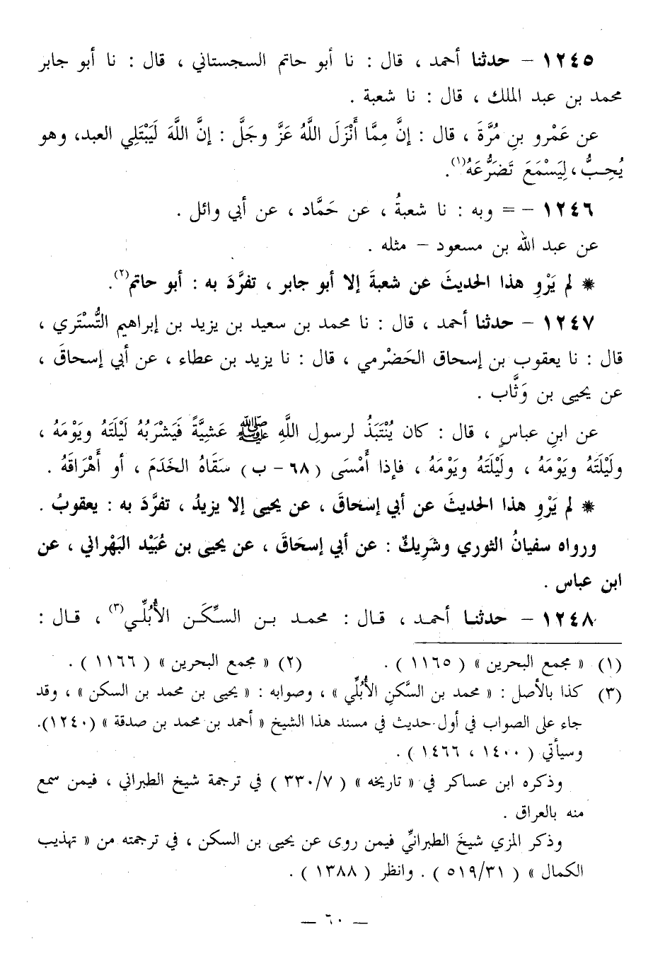1245 - حَدَّثَنَا أَحْمَدُ قَالَ: نا أَبُو حَاتِمٍ السِّجِسْتَانِيُّ قَالَ: نا أَبُو جَابِرٍ مُحَمَّدُ بْنِ عَبْدِ الْمَلِكِ قَالَ: نا شُعْبَةُ، عَنْ عَمْرِو بْنِ مُرَّةَ قَالَ: «إِنَّ §مِمَّا أَنْزَلَ اللَّهُ عَزَّ وَجَلَّ: إِنَّ اللَّهَ لَيُبْتَلِي الْعَبْدَ وَهُوَ يُحِبُّ، لَيُسْمَعَ تَضَرُّعُهُ»