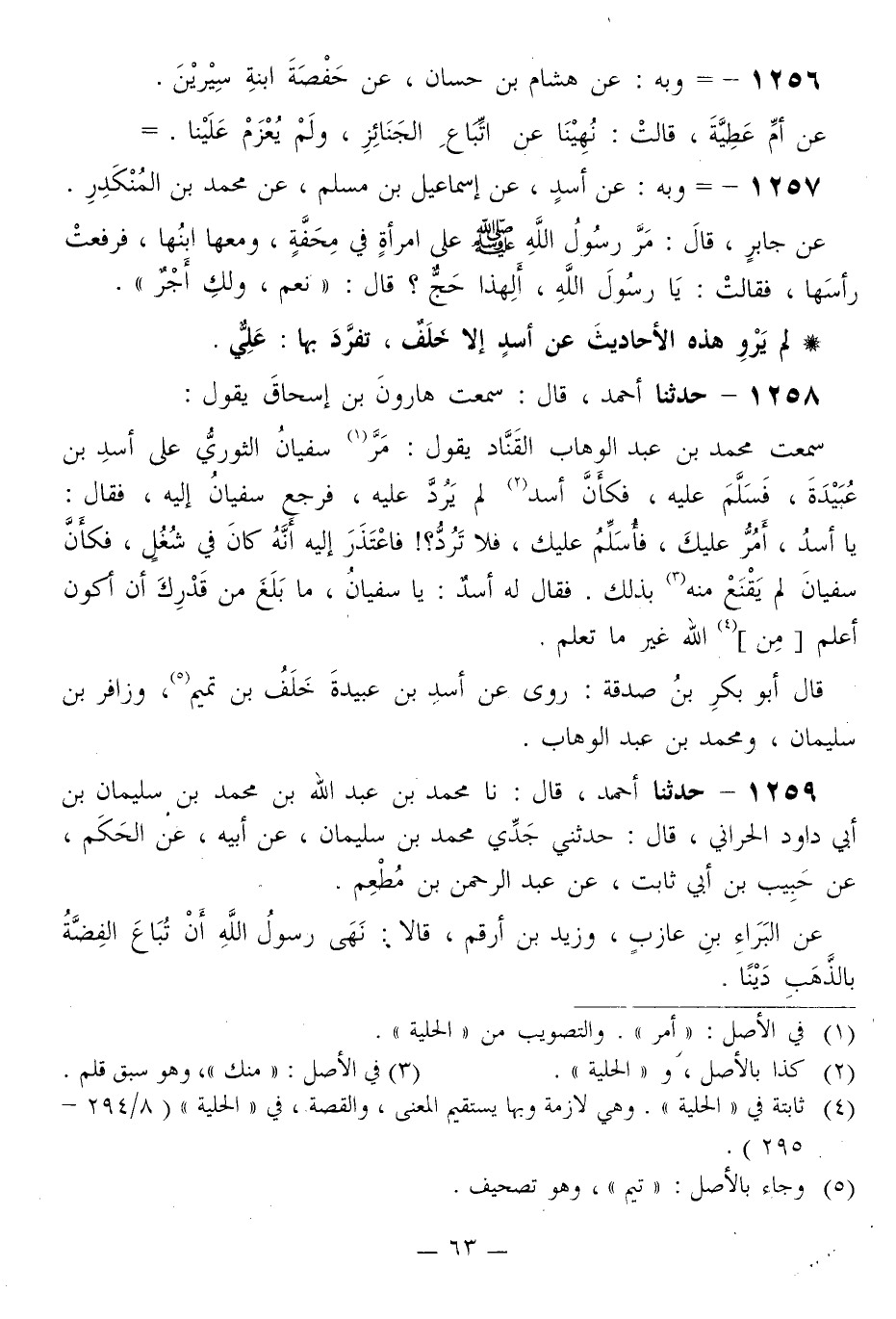 1258 - حَدَّثَنَا أَحْمَدُ قَالَ: سَمِعْتُ هَارُونَ بْنَ إِسْحَاقَ يَقُولُ: سَمِعْتُ مُحَمَّدَ بْنَ عَبْدِ الْوَهَّابِ الْقَنَّادَ يَقُولُ: مَرَّ سُفْيَانُ الثَّوْرِيُّ عَلَى أَسَدِ بْنِ عُبَيْدَةَ، فَسَلَّمَ عَلَيْهِ، فَكَأَنَّ أَسَدًا لَمْ يَرُدَّ عَلَيْهِ، فَرَجَعَ سُفْيَانُ إِلَيْهِ، فَقَالَ: يَا أَسَدُ، أَمُرُّ عَلَيْكَ، فَأُسَلِّمُ عَلَيْكَ، فَلَا تَرُدُّ فَاعْتَذَرَ إِلَيْهِ أَنَّهُ كَانَ فِي شُغْلٍ، فَكَأَنَّ سُفْيَانَ لَمْ يَقْنَعْ مِنْهُ بِذَلِكَ. فَقَالَ لَهُ أَسَدٌ: «يَا سُفْيَانُ، §مَا بَلَغَ مِنْ قَدْرِكَ أَنْ أَكُونَ أَعْلَمَ مِنَ اللَّهِ غَيْرَ مَا تَعْلَمُ» قَالَ أَبُو بَكْرِ بْنُ صَدَقَةَ: «رَوَى عَنْ أَسَدِ بْنِ عُبَيْدَةَ، خَلَفُ بْنُ تَمِيمٍ، وَزَافِرُ بْنُ سُلَيْمَانَ، وَمُحَمَّدُ بْنُ عَبْدِ الْوَهَّابِ»