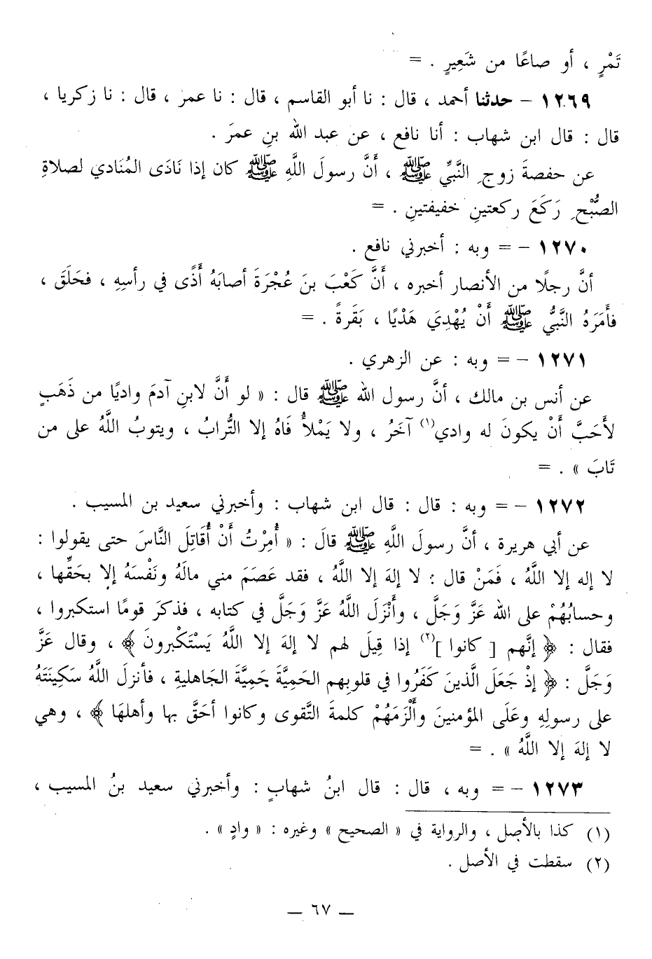 1271 - وَبِهِ: عَنِ الزُّهْرِيِّ، عَنْ أَنَسِ بْنِ مَالِكٍ، أَنَّ رَسُولَ اللَّهِ صَلَّى اللهُ عَلَيْهِ وَسَلَّمَ قَالَ: «§لَوْ أَنَّ لِابْنِ آدَمَ وَادِيًا مِنْ ذَهَبٍ لَأَحَبَّ أَنْ يَكُونَ لَهُ وَادٍ آخَرُ، وَلَا يَمْلَأُ فَاهُ إِلَّا التُّرَابُ، وَيَتُوبُ اللَّهُ عَلَى مَنْ تَابَ»