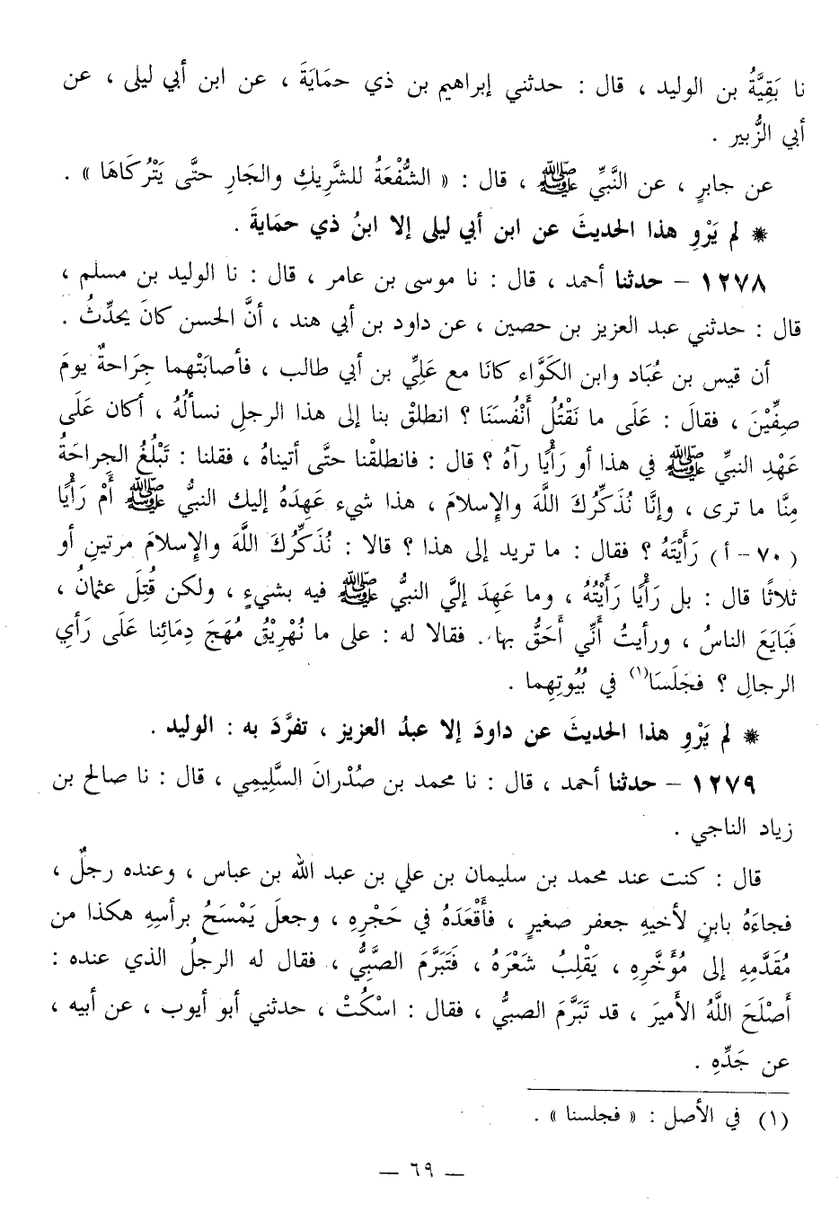 1278 - حَدَّثَنَا أَحْمَدُ قَالَ: نا مُوسَى بْنُ عَامِرٍ قَالَ: نا الْوَلِيدُ بْنُ مُسْلِمٍ قَالَ: حَدَّثَنِي عَبْدُ الْعَزِيزِ بْنُ حَصِينٍ، عَنْ دَاوُدَ بْنِ أَبِي هِنْدَ، أَنَّ الْحَسَنَ، كَانَ يُحَدِّثُ أَنَّ قَيْسَ بْنَ عُبَادٍ وَابْنَ الْكَوَّاءِ كَانَا مَعَ عَلِيِّ بْنِ أَبِي طَالِبٍ، فَأَصَابَتْهُمَا جِرَاحَةٌ يَوْمَ صِفِّينَ، فَقَالَ: عَلِيٌّ مَا نَقْتُلُ أَنْفُسُنَا؟ انْطَلِقْ بِنَا إِلَى هَذَا الرَّجُلِ نَسْأَلُهُ، أَكَانَ عَلَى عَهْدِ النَّبِيِّ صَلَّى اللهُ عَلَيْهِ وَسَلَّمَ فِي هَذَا أَوْ رَأَيًا رَآهُ؟ قَالَ: فَانْطَلَقْنَا حَتَّى أَتَيْنَاهُ، فَقُلْنَا: تَبْلُغُ الْجِرَاحَةُ مِنَّا مَا تَرَى، وَإِنَّا نُذَكِّرُكَ اللَّهَ وَالْإِسْلَامَ، هَذَا شَيْءٌ عَهِدَهُ إِلَيْكَ النَّبِيُّ صَلَّى اللهُ عَلَيْهِ وَسَلَّمَ أَمْ رَأَيًا رَأَيْتَهُ؟ فَقَالَ: مَا تُرِيدُ إِلَى هَذَا؟ قَالَا: نُذَكِّرُكَ اللَّهَ وَالْإِسْلَامَ، مَرَّتَيْنِ أَوْ ثَلَاثًا قَالَ: «§بَلْ رَأَيًا رَأَيْتُهُ، وَمَا عَهِدَ إِلَيَّ النَّبِيُّ صَلَّى اللهُ عَلَيْهِ وَسَلَّمَ فِيهِ بِشَيْءٍ، وَلَكِنْ قُتِلَ عُثْمَانُ، فَبَايَعَ النَّاسُ، وَرَأَيْتُ أَنِّي أَحَقُّ بِهَا» . فَقَالَا لَهُ: عَلَى مَا نُهَرِيقُ مُهَجَ دِمَائِنَا على رَأْيِ الرِّجَالِ؟ فَجَلَسَا فِي بُيُوتِهِمَا «
