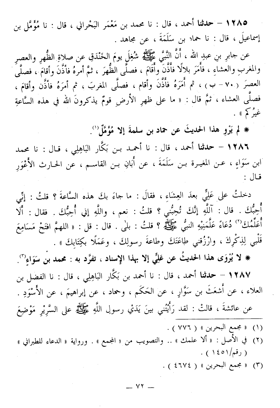 1285 - حَدَّثَنَا أَحْمَدُ قَالَ: نا مُحَمَّدُ بْنُ مَعْمَرٍ الْبَحْرَانِيُّ قَالَ: نا مُؤَمَّلُ بْنُ إِسْمَاعِيلَ قَالَ: نا حَمَّادُ بْنُ سَلَمَةَ، عَنْ مُجَاهِدٍ، عَنْ جَابِرِ بْنِ عَبْدِ اللَّهِ، أَنَّ النَّبِيَّ صَلَّى اللهُ عَلَيْهِ وَسَلَّمَ شُغِلَ يَوْمَ الْخَنْدَقِ عَنْ صَلَاةِ الظُّهْرِ وَالْعَصْرِ وَالْمَغْرِبِ وَالْعِشَاءِ، «فَأَمَرَ بِلَالًا فَأَذَّنَ وَأَقَامَ، فَصَلَّى الظُّهْرَ، ثُمَّ أَمَرَهُ فَأَذَّنَ وَأَقَامَ، فَصَلَّى الْعَصْرَ، ثُمَّ أَمَرَهُ فَأَذَّنَ وَأَقَامَ، فَصَلَّى الْمَغْرِبَ، ثُمَّ أَمَرَهُ فَأَذَّنَ وَأَقَامَ، فَصَلَّى الْعِشَاءَ» ، ثُمَّ قَالَ: «§مَا عَلَى ظَهْرِ الْأَرْضِ قَوْمٌ يَذْكُرُونَ اللَّهَ فِي هَذِهِ السَّاعَةِ غَيْرُكُمْ»