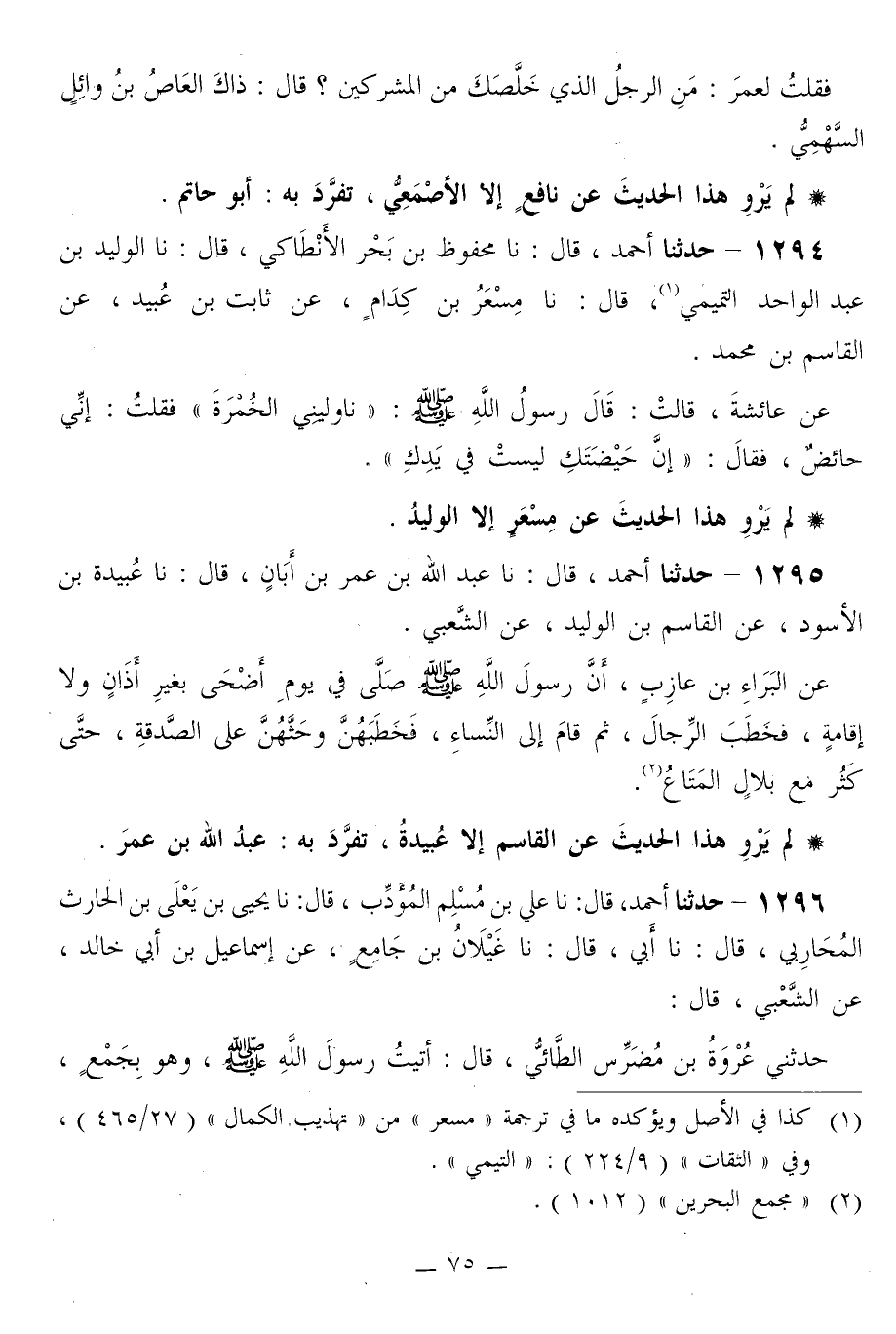 1296 - حَدَّثَنَا أَحْمَدُ قَالَ: نا عَلِيُّ بْنُ مُسْلِمٍ الْمُؤَدِّبُ قَالَ: نا يَحْيَى بْنُ يَعْلَى بْنِ الْحَارِثِ الْمُحَارِبِيُّ قَالَ: نا أَبِي قَالَ: نا غَيْلَانُ بْنُ جَامِعٍ، عَنْ إِسْمَاعِيلَ بْنِ أَبِي خَالِدٍ، عَنِ الشَّعْبِيِّ قَالَ: حَدَّثَنِي عُرْوَةُ بْنُ مُضَرِّسٍ الطَّائِيُّ قَالَ: أَتَيْتُ رَسُولَ اللَّهِ صَلَّى اللهُ عَلَيْهِ وَسَلَّمَ وَهُوَ بِجَمْعٍ، -[76]- وَالنَّاسُ حَوْلَهُ، فَقُلْتُ: يَا رَسُولَ اللَّهِ، إِنِّي أَتَيْتُ مِنْ جَبَلِ طَيِّئٍ، وَإِنِّي قَدْ آذَيْتُ نَفْسِي وَرَاحِلَتِي، فَلَا وَاللَّهِ، مَا تَرَكْتُ حَبْلًا إِلَّا وَقَفَتْ عَلَيْهِ. فَهَلْ لِي مِنْ حَجٍّ؟ فَقَالَ رَسُولُ اللَّهِ صَلَّى اللهُ عَلَيْهِ وَسَلَّمَ: «§مَنْ أَدْرَكَ مَعَنَا صَلَاةَ الْغَدَاةِ بِجَمْعٍ، وَقَدْ أَفَاضَ قَبْلَ ذَلِكَ مِنْ عَرَفَاتٍ لَيْلًا أَوْ نَهَارًا، فَقَدْ قَضَى تَفَثَهُ، وَتَمَّ حَجُّهُ»