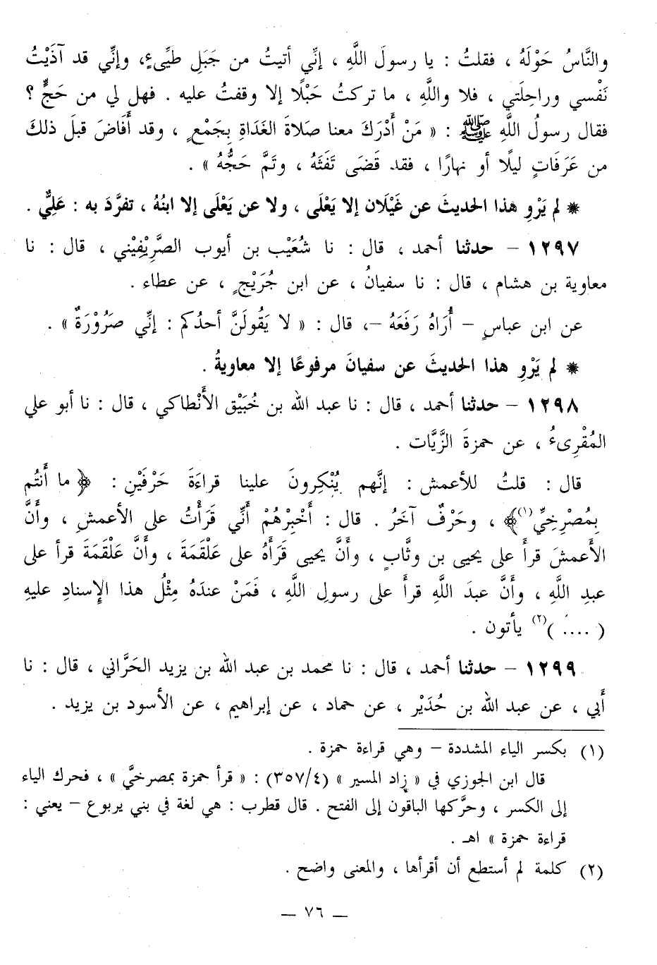 1298 - حَدَّثَنَا أَحْمَدُ قَالَ: نا عَبْدُ اللَّهِ بْنُ خُبَيْقٍ الْأَنْطَاكِيُّ قَالَ: نا أَبُو عَلِيٍّ الْمُقْرِئُ، عَنْ حَمْزَةَ الزَّيَّاتِ قَالَ: قُلْتُ لِلْأَعْمَشِ: «§إِنَّهُمْ يُنْكِرُونَ عَلَيْنَا قِرَاءَةَ حَرْفَيْنِ: (مَا أَنْتُمْ بِمُصْرِخِيِّ) وَحَرْفٌ آخَرُ» قَالَ: أَخْبِرْهُمْ أَنِّي قَرَأْتُ عَلَى الْأَعْمَشِ، وَأَنَّ الْأَعْمَشَ، قَرَأَ عَلَى يَحْيَى بْنِ وَثَّابٍ، وَأَنَّ يَحْيَى، قَرَأَهُ عَلَى عَلْقَمَةَ، وَأَنَّ عَلْقَمَةَ، قَرَأَ عَلَى عَبْدِ اللَّهِ، وَأَنَّ عَبْدَ اللَّهِ، قَرَأَ عَلَى رَسُولِ اللَّهِ، فَمَنْ عِنْدَهُ مِثْلُ هَذَا الْإِسْنَادِ عَلَيْهِ يَأْتُونَ