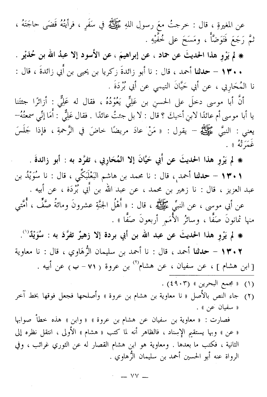 1300 - حَدَّثَنَا أَحْمَدُ قَالَ: نا أَبُو زَائِدَةَ زَكَرِيَّا بْنُ يَحْيَى بْنِ أَبِي زَائِدَةَ قَالَ: نا الْمُحَارِبِيُّ، عَنْ أَبِي حَيَّانَ التَّيْمِيِّ، عَنْ أَبِي بُرْدَةَ، أَنَّ أَبَا مُوسَى، دَخَلَ عَلَى الْحَسَنِ بْنِ عَلِيٍّ يَعُودُهُ، فَقَالَ لَهُ عَلِيٌّ: أَزَائِرًا جِئْتَنَا يَا أَبَا مُوسَى أَمْ عَائِدًا لِابْنِ أَخِيكَ؟ قَالَ: لَا بَلْ جِئْتُ عَائِدًا. فَقَالَ عَلِيٌّ: أَمَا إِنِّي سَمِعَتْهُ، يَعْنِي: النَّبِيَّ صَلَّى اللهُ عَلَيْهِ وَسَلَّمَ يَقُولُ: «§مَنْ عَادَ مَرِيضًا خَاضَ فِي الرَّحْمَةِ، فَإِذَا جَلَسَ غَمَرَتْهُ»