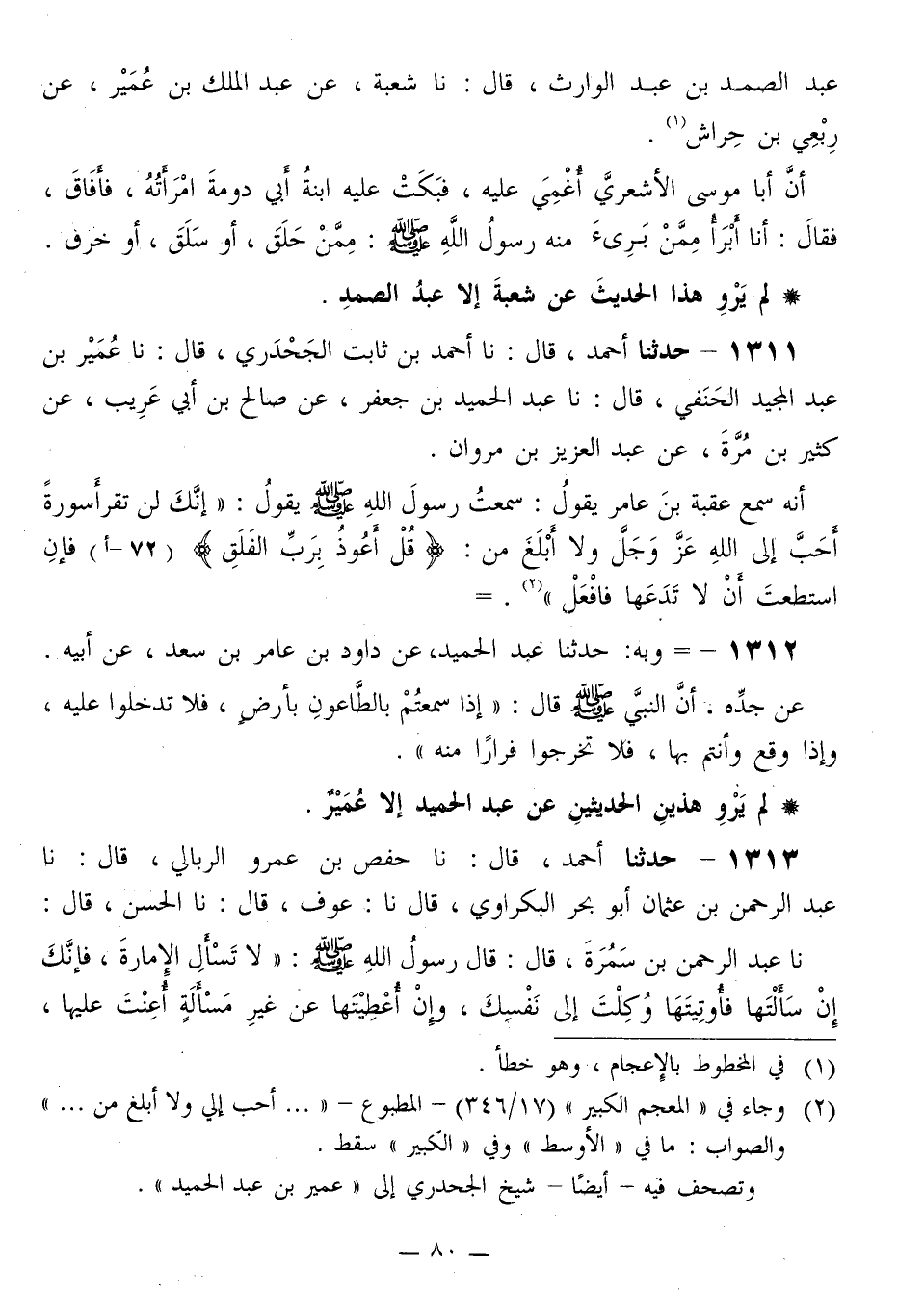 1311 - حَدَّثَنَا أَحْمَدُ قَالَ: نا أَحْمَدُ بْنُ ثَابِتٍ الْجَحْدَرِيُّ قَالَ: نا عُمَيْرُ بْنُ عَبْدِ الْمَجِيدِ الْحَنَفِيُّ قَالَ: نا عَبْدُ الْحَمِيدِ بْنُ جَعْفَرٍ، عَنْ صَالِحِ بْنِ أَبِي عَرِيبٍ، عَنْ كَثِيرِ بْنِ مُرَّةَ، عَنْ عَبْدِ الْعَزِيزِ بْنِ مَرْوَانَ، أَنَّهُ سَمِعَ عُقْبَةَ بْنَ عَامِرٍ يَقُولُ: سَمِعْتُ رَسُولَ اللَّهِ صَلَّى اللهُ عَلَيْهِ وَسَلَّمَ يَقُولُ: «إِنَّكَ §لَنْ تَقْرَأَ سُورَةً أَحَبَّ إِلَى اللَّهِ عَزَّ وَجَلَّ وَلَا أَبْلَغَ مِنْ: قُلْ أَعُوذُ بِرَبِّ الْفَلَقِ فَإِنِ اسْتَطَعْتَ أَنْ لَا تَدَعَهَا فَافْعَلْ»