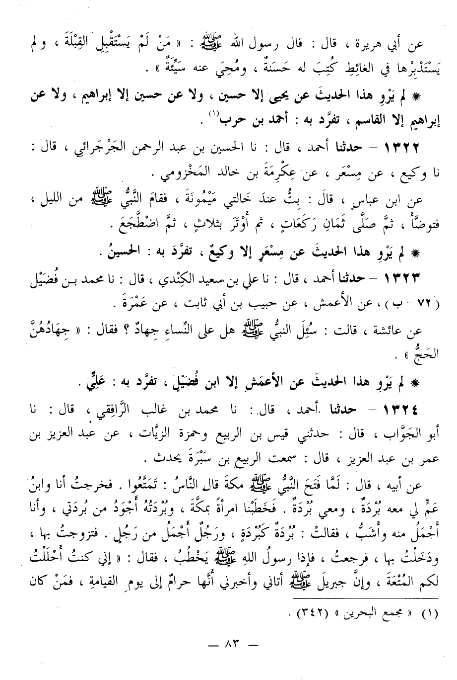 1324 - حَدَّثَنَا أَحْمَدُ قَالَ: نا مُحَمَّدُ بْنُ غَالِبٍ الرَّافِقِيُّ قَالَ: نا أَبُو الْجَوَّابِ قَالَ: حَدَّثَنِي قَيْسُ بْنُ الرَّبِيعِ، وحَمْزَةُ الزَّيَّاتُ، عَنْ عَبْدِ الْعَزِيزِ بْنِ عُمَرَ بْنِ عَبْدِ الْعَزِيزِ قَالَ: سَمِعْتُ الرَّبِيعَ بْنَ سَبْرَةَ يُحَدِّثُ، عَنْ أَبِيهِ قَالَ: لَمَّا فَتَحَ النَّبِيُّ صَلَّى اللهُ عَلَيْهِ وَسَلَّمَ مَكَّةَ قَالَ النَّاسُ: تَمَتَّعُوا. فَخَرَجْتُ أَنَا وَابْنُ عَمٍّ لِي مَعَهُ بُرْدَةٌ، وَمَعِي بُرْدَةٌ. فَخَطَبْنَا امْرَأَةً بِمَكَّةَ، وَبُرْدَتُهُ أَجْوَدُ مِنْ بُرْدَتِي، وَأَنَا أَجْمَلُ مِنْهُ وَأَشَبُّ، فَقَالَتْ: بُرْدَةٌ كَبُرْدَةٍ، وَرَجُلٌ أَجْمَلُ مِنْ رَجُلٍ. فَتَزَوَّجْتُ بِهَا، وَدَخَلْتُ بِهَا، فَرَجَعْتُ، فَإِذَا رَسُولُ اللَّهِ صَلَّى اللهُ عَلَيْهِ وَسَلَّمَ يَخْطُبُ، فَقَالَ: «إِنِّي §كُنْتُ أَحْلَلْتُ لَكُمُ الْمُتْعَةَ، وَإِنَّ جِبْرِيلَ صَلَّى اللهُ عَلَيْهِ وَسَلَّمَ أَتَانِي وَأَخْبَرَنِي أَنَّهَا حَرَامٌ إِلَى يَوْمِ الْقِيَامَةِ، فَمَنْ كَانَ -[84]- دَخَلَ مِنْكُمْ بِامْرَأَةٍ فَلَا يَعُودَنَّ إِلَيْهَا، وَلَا تَأْخُذُوا مِمَّا آتَيْتُمُوهُنَّ شَيْئًا»