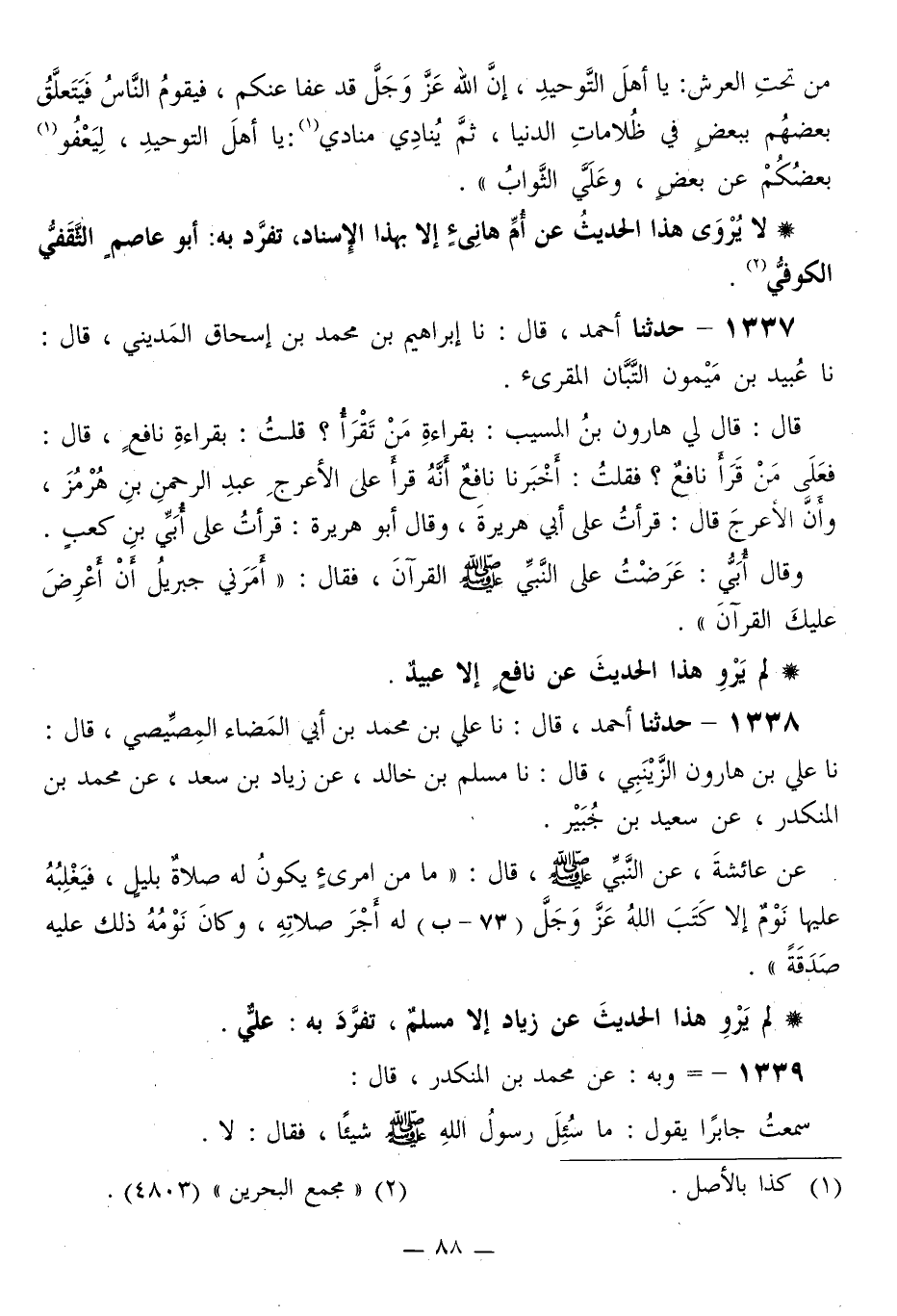 1337 - حَدَّثَنَا أَحْمَدُ قَالَ: نا إِبْرَاهِيمُ بْنُ مُحَمَّدِ بْنِ إِسْحَاقَ الْمَدِينِيُّ قَالَ: نا عُبَيْدُ بْنُ مَيْمُونٍ التَّبَّانُ الْمُقْرِئُ قَالَ: قَالَ لِي هَارُونُ بْنُ الْمُسَيَّبِ: بِقِرَاءَةِ مَنْ تَقْرَأُ؟ فَقُلْتُ: بِقِرَاءَةِ نَافِعٍ قَالَ: فَعَلَى مَنْ قَرَأَ نَافِعٌ؟ فَقُلْتُ: أَخْبَرَنَا نَافِعٌ، أَنَّهُ قَرَأَ عَلَى الْأَعْرَجِ عَبْدِ الرَّحْمَنِ بْنِ هُرْمُزَ، وَأَنَّ الْأَعْرَجَ قَالَ: قَرَأْتُ عَلَى أَبِي هُرَيْرَةَ، وَقَالَ أَبُو هُرَيْرَةَ: قَرَأْتُ عَلَى أُبَيِّ بْنِ كَعْبٍ وَقَالَ أُبَيٌّ: عَرَضْتُ عَلَى النَّبِيِّ صَلَّى اللهُ عَلَيْهِ وَسَلَّمَ الْقُرْآنَ، فَقَالَ: «§أَمَرَنِي جِبْرِيلُ أَنْ أَعْرِضَ عَلَيْكَ الْقُرْآنَ»