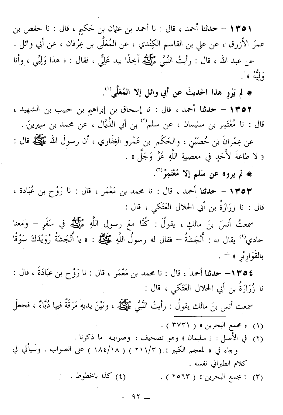 1352 - حَدَّثَنَا أَحْمَدُ قَالَ: نا إِسْحَاقُ بْنُ إِبْرَاهِيمَ بْنِ حَبِيبِ بْنِ الشَّهِيدِ قَالَ: نا مُعْتَمِرُ بْنُ سُلَيْمَانَ، عَنْ سَلْمِ بْنِ أَبِي الذَّيَّالِ، عَنْ مُحَمَّدِ بْنِ سِيرِينَ، عَنْ عِمْرَانَ بْنِ حُصَيْنٍ، وَالْحَكَمِ بْنِ عَمْرٍو الْغِفَارِيِّ، أَنَّ رَسُولَ اللَّهِ صَلَّى اللهُ عَلَيْهِ وَسَلَّمَ قَالَ: «§لَا طَاعَةَ لِأَحَدٍ فِي مَعْصِيَةِ اللَّهِ عَزَّ وَجَلَّ»