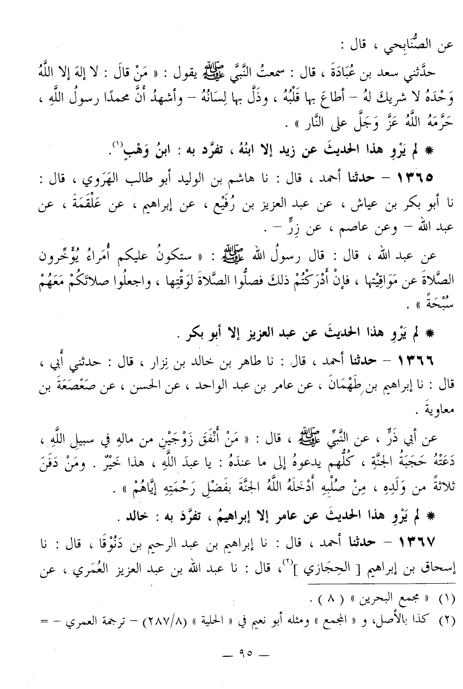 1365 - حَدَّثَنَا أَحْمَدُ قَالَ: نا هَاشِمُ بْنُ الْوَلِيدِ أَبُو طَالِبٍ الْهَرَوِيُّ قَالَ: نا أَبُو بَكْرِ بْنُ عَيَّاشٍ، عَنْ عَبْدِ الْعَزِيزِ بْنِ رُفَيْعٍ، عَنْ إِبْرَاهِيمَ، عَنْ عَلْقَمَةَ، عَنْ عَبْدِ اللَّهِ، وَعَنْ عَاصِمٍ، عَنْ زِرٍّ، عَنْ عَبْدِ اللَّهِ قَالَ: قَالَ رَسُولُ اللَّهِ صَلَّى اللهُ عَلَيْهِ وَسَلَّمَ: «§سَتَكُونُ عَلَيْكُمْ أُمَرَاءُ يُؤَخِّرُونَ الصَّلَاةَ عَنْ مَوَاقِيتِهَا، فَإِنْ أَدْرَكْتُمْ ذَلِكَ فَصَلُّوا الصَّلَاةَ لِوَقْتِهَا، وَاجْعَلُوا صَلَاتَكُمْ مَعَهُمْ سُبْحَةً»