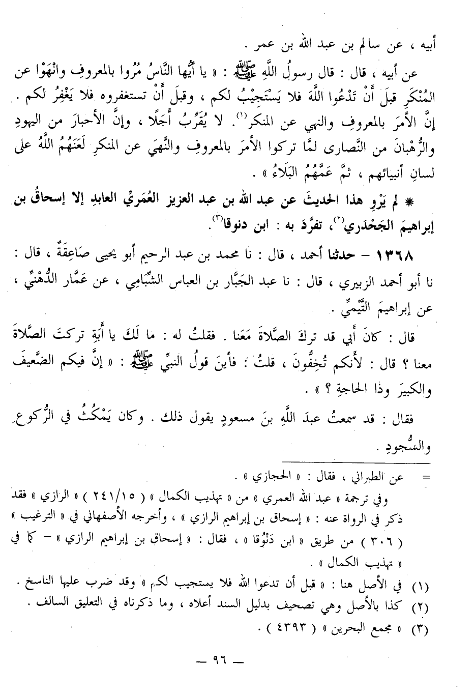 1368 - حَدَّثَنَا أَحْمَدُ قَالَ: نا مُحَمَّدُ بْنُ عَبْدِ الرَّحِيمِ أَبُو يَحْيَى صَاعِقَةُ قَالَ: نا أَبُو أَحْمَدَ الزُّبَيْرِيُّ قَالَ: نا عَبْدُ الْجَبَّارِ بْنُ الْعَبَّاسِ الشِّبَامِيُّ، عَنْ عَمَّارٍ الدُّهْنِيِّ، عَنْ إِبْرَاهِيمَ التَّيْمِيِّ قَالَ: كَانَ أَبِي قَدْ تَرَكَ الصَّلَاةَ مَعَنَا. فَقُلْتُ لَهُ: مَا لَكَ يَا أَبَةِ تَرَكْتَ الصَّلَاةَ مَعَنَا؟ قَالَ: لِأَنَّكُمْ تُخِفُّونَ، قُلْتُ: فَأَيْنَ قَوْلُ النَّبِيِّ صَلَّى اللهُ عَلَيْهِ وَسَلَّمَ: «إِنَّ §فِيكُمُ الضَّعِيفَ وَالْكَبِيرَ وَذَا الْحَاجَةِ؟» . فَقَالَ: قَدْ سَمِعْتُ عَبْدَ اللَّهِ بْنَ مَسْعُودٍ يَقُولُ ذَلِكَ. وَكَانَ يَمْكُثُ فِي الرُّكُوعِ -[97]- وَالسُّجُودِ «