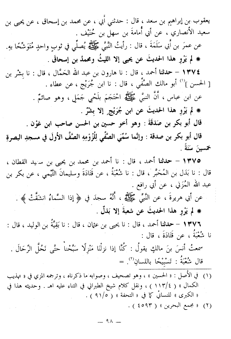 1376 - حَدَّثَنَا أَحْمَدُ قَالَ: نا يَحْيَى بْنُ عُثْمَانَ قَالَ: نا بَقِيَّةُ بْنُ الْوَلِيدِ قَالَ: نا شُعْبَةُ، عَنْ قَتَادَةَ قَالَ: سَمِعْتُ أَنَسَ بْنَ مَالِكٍ يَقُولُ: «كُنَّا §إِذَا نَزَلْنَا مَنْزِلًا سَبَّحْنَا حَتَّى نَحِلَّ الرِّحَالَ» قَالَ شُعْبَةُ: «تَسْبِيحًا بِاللِّسَانِ»