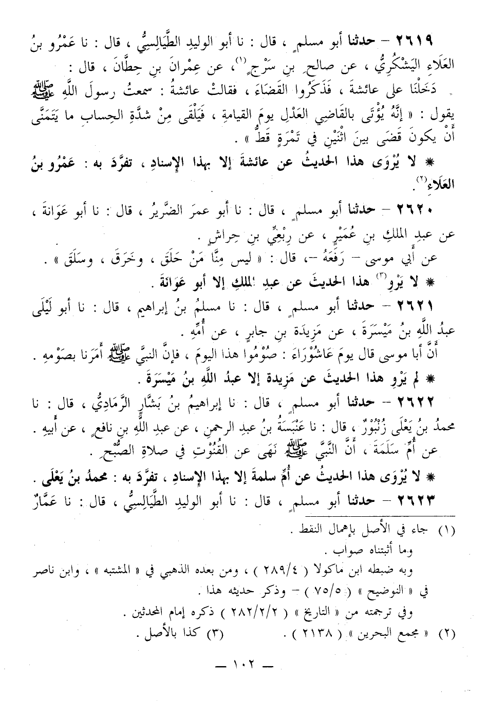 2619 - حَدَّثَنَا أَبُو مُسْلِمٍ قَالَ: نا أَبُو الْوَلِيدِ الطَّيَالِسِيُّ قَالَ: نا عَمْرُو بْنُ الْعَلَاءِ الْيَشْكُرِيُّ، عَنْ صَالِحِ بْنِ سَرْجٍ، عَنْ عِمْرَانَ بْنِ حِطَّانَ قَالَ: دَخَلْنَا عَلَى عَائِشَةَ، فَذَكَرُوا الْقَضَاءَ، فَقَالَتْ عَائِشَةُ: سَمِعْتُ رَسُولَ اللَّهِ صَلَّى اللهُ عَلَيْهِ وَسَلَّمَ يَقُولُ: «إِنَّهُ §يُؤْتَى بِالْقَاضِي الْعَدْلِ يَوْمَ الْقِيَامَةِ، فَيْلَقَى مِنْ شِدَّةِ الْحِسَابِ مَا يَتَمَنَّى أَنْ يَكُونَ قَضَى بَيْنَ اثْنَيْنِ فِي تَمْرَةٍ قَطُّ»
