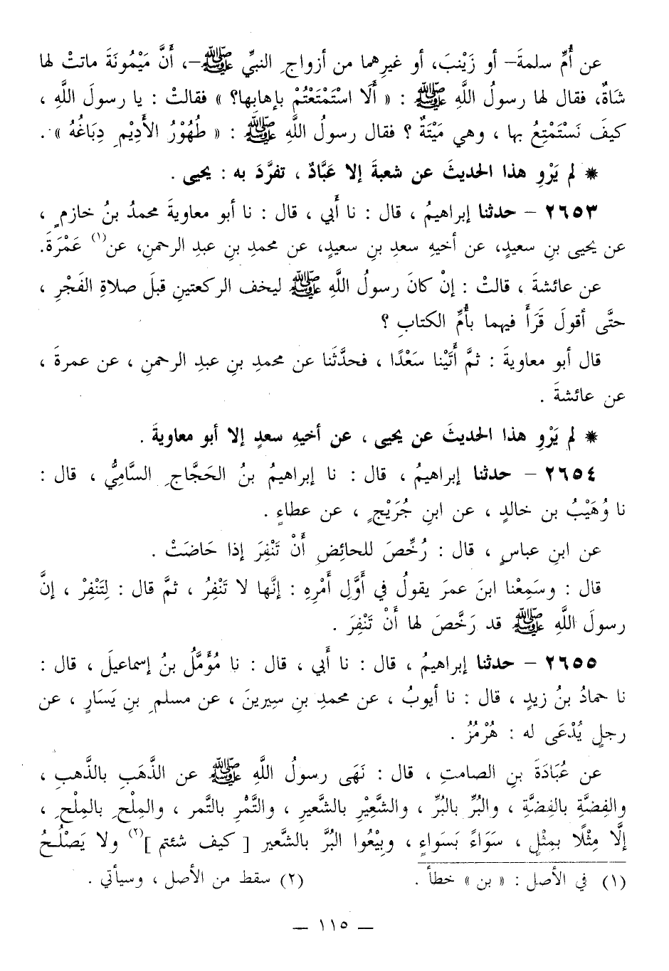 2655 - حَدَّثَنَا إِبْرَاهِيمُ قَالَ: نا أَبِي قَالَ: نا مُؤَمَّلُ بْنُ إِسْمَاعِيلَ قَالَ: نا حَمَّادُ بْنُ زَيْدٍ قَالَ: نا أَيُّوبُ، عَنْ مُحَمَّدِ بْنِ سِيرِينَ، عَنِ مُسْلِمِ بْنِ يَسَارٍ، عَنْ رَجُلٍ يُدْعَى لَهُ: هُرْمُزُ، عَنْ عُبَادَةَ بْنِ الصَّامِتِ قَالَ: «§نَهَى رَسُولُ اللَّهِ صَلَّى اللهُ عَلَيْهِ وَسَلَّمَ عَنِ الذَّهَبِ بِالذَّهَبِ، وَالْفِضَّةِ بِالْفِضَّةِ، وَالْبُرِّ بِالْبُرِّ، وَالشَّعِيرِ بِالشَّعِيرِ، وَالتَّمْرِ بِالتَّمْرِ، وَالْمِلْحِ بِالْمِلْحِ، إِلَّا مِثْلًا بِمِثْلٍ، سَوَاءً بِسَوَاءٍ، وَبِيعُوا الْبُرَّ بِالشَّعِيرِ كَيْفَ شِئْتُمْ، وَلَا يَصْلُحُ -[116]- نَسِيئَةً، وَبِيعُوا الذَّهَبَ بِالْفِضَّةِ كَيْفَ شِئْتُمْ، ولَا يَصْلُحُ نَسِيئَةً»