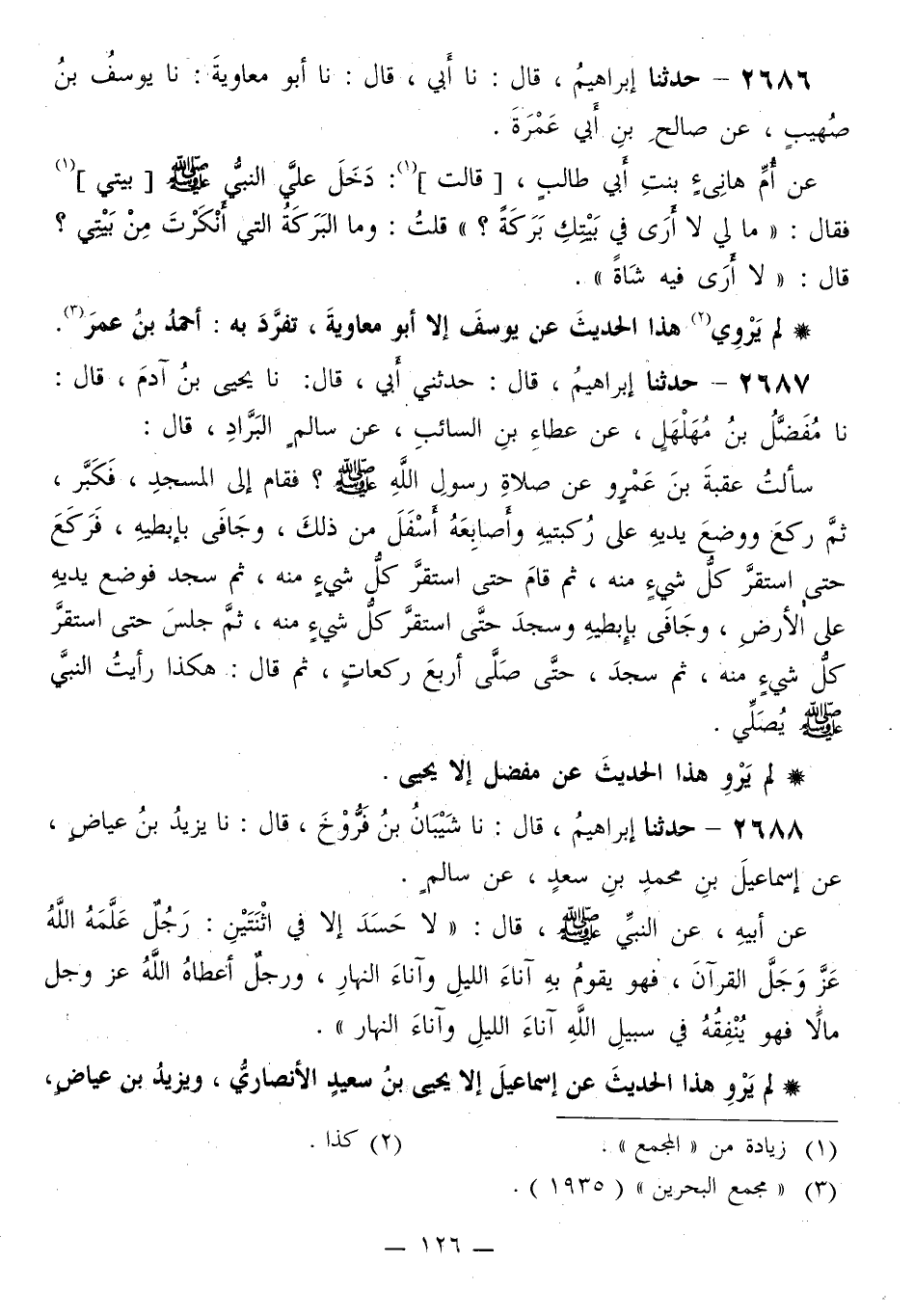 2686 - حَدَّثَنَا إِبْرَاهِيمُ قَالَ: نا أَبِي قَالَ: نا أَبُو مُعَاوِيَةَ، نا يُوسُفُ بْنُ صُهَيْبٍ، عَنْ صَالِحِ بْنِ أَبِي عَمْرَةَ، عَنْ أُمِّ هَانِئٍ بِنْتِ أَبِي طَالِبٍ قَالَتْ: دَخَلَ عَلَيَّ النَّبِيُّ صَلَّى اللهُ عَلَيْهِ وَسَلَّمَ بَيْتِي فَقَالَ: «§مَا لِي لَا أَرَى فِي بَيْتِكِ بَرَكَةً؟» قُلْتُ: وَمَا الْبَرَكَةُ الَّتِي أَنْكَرْتَ مِنْ بَيْتِي؟ قَالَ: «لَا أَرَى فِيهِ شَاةً»