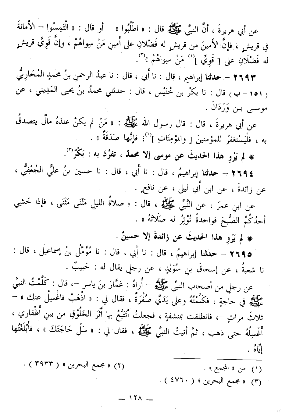 2695 - حَدَّثَنَا إِبْرَاهِيمُ قَالَ: نا أَبِي قَالَ: نا مُؤَمَّلُ بْنُ إِسْمَاعِيلَ قَالَ: نا شُعْبَةُ، عَنْ إِسْحَاقَ بْنِ سُوَيْدٍ، عَنْ رَجُلٍ يُقَالُ لَهُ: حَبِيبٌ، عَنْ رَجُلٍ، مِنْ أَصْحَابِ النَّبِيِّ صَلَّى اللهُ عَلَيْهِ وَسَلَّمَ أُرَاهُ: عَمَّارَ بْنَ يَاسِرٍ قَالَ: كَلَّمْتُ النَّبِيَّ صَلَّى اللهُ عَلَيْهِ وَسَلَّمَ فِي حَاجَةٍ، فَكَلَّمْتُهُ وَعَلَى يَدَيَّ صُفْرَةٌ، فَقَالَ لِي: «§اذْهَبْ فَاغْسِلْ عَنْكَ» ، ثَلَاثَ مَرَّاتٍ، فَانْطَلَقْتُ بِمِنْشَفَةٍ، فَجَعَلْتُ أَتَتَبَّعُ بِهَا أَثَرَ الْخَلُوقِ مِنْ بَيْنِ أَظْفَارِي، أَغْسِلُهُ حَتَّى ذَهَبَ، ثُمَّ أَتَيْتُ النَّبِيَّ صَلَّى اللهُ عَلَيْهِ وَسَلَّمَ، فَقَالَ لِي: «سَلْ حَاجَتَكَ» فَأَبْلَغْتُهَا إِيَّاهُ -[129]- لَمْ يَرْوِ هَذَا الْحَدِيثَ عَنْ شُعْبَةَ إِلَّا مُؤَمَّلٌ، تَفَرَّدَ بِهِ أَحْمَدُ بْنُ عُمَرَ