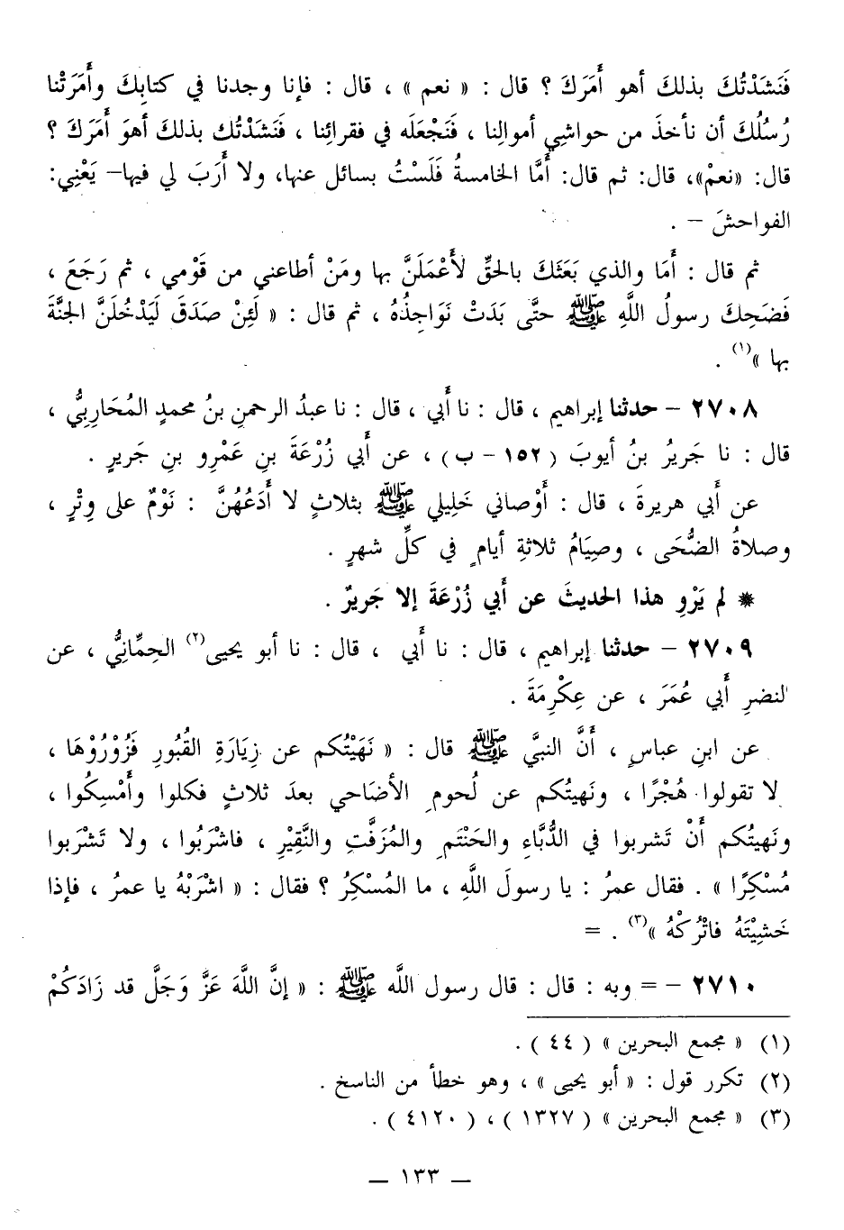 2709 - حَدَّثَنَا إِبْرَاهِيمُ قَالَ: نا أَبِي قَالَ: نا أَبُو يَحْيَى الْحِمَّانِيُّ، عَنِ النَّضْرِ أَبِي عُمَرَ، عَنْ عِكْرِمَةَ، عَنِ ابْنِ عَبَّاسٍ، أَنَّ النَّبِيَّ صَلَّى اللهُ عَلَيْهِ وَسَلَّمَ قَالَ: «§نَهَيْتُكُمْ عَنْ زِيَارَةِ الْقُبُورِ فَزُورُوهَا، وَلَا تَقُولُوا هُجْرًا، وَنَهَيْتُكُمْ عَنْ لُحُومِ الْأَضَاحِيِّ بَعْدَ ثَلَاثٍ فَكُلُوا وَأَمْسِكُوا، وَنَهَيْتُكُمْ أَنْ تَشْرَبُوا فِي الدُّبَّاءِ وَالْحَنْتَمِ وَالْمُزَفَّتِ وَالنَّقِيرِ، فَاشْرَبُوا، وَلَا تَشْرَبُوا مُسْكِرًا» فَقَالَ عُمَرُ: يَا رَسُولَ اللَّهِ، مَا الْمُسْكِرُ؟ فَقَالَ: «اشْرَبْهُ يَا عُمَرُ، فَإِذَا خَشِيتَهُ فَاتْرُكْهُ»