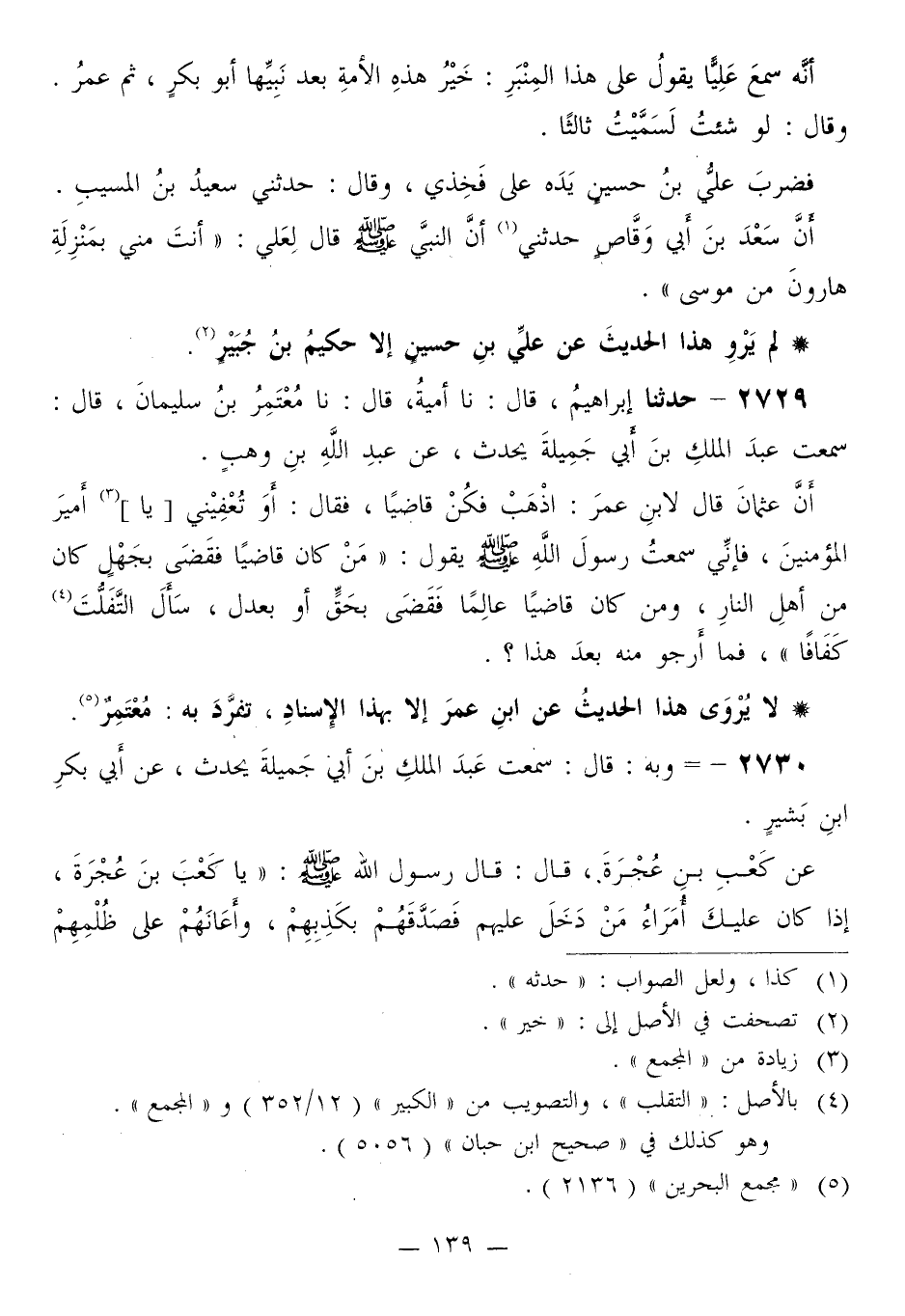 فَضَرَبَ عَلِيُّ بْنُ حُسَيْنٍ يَدَهُ عَلَى فَخِذِي وَقَالَ: حَدَّثَنِي سَعِيدُ بْنُ الْمُسَيِّبِ أَنَّ سَعْدَ بْنَ أَبِي وَقَّاصٍ حَدَّثَنِي، أَنَّ النَّبِيَّ صَلَّى اللهُ عَلَيْهِ وَسَلَّمَ قَالَ لِعَلِيٍّ: «§أَنْتَ مِنِّي بِمَنْزِلَةِ هَارُونَ مِنْ مُوسَى»