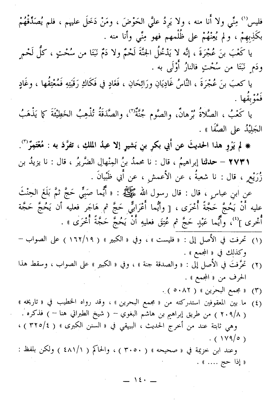 2731 - حَدَّثَنَا إِبْرَاهِيمُ قَالَ: نا مُحَمَّدُ بْنُ الْمِنْهَالِ الضَّرِيرُ قَالَ: نا يَزِيدُ بْنُ زُرَيْعٍ قَالَ: نا شُعْبَةُ، عَنِ الْأَعْمَشِ، عَنْ أَبِي ظَبْيَانَ، عَنِ ابْنِ عَبَّاسٍ قَالَ: قَالَ رَسُولُ اللَّهِ صَلَّى اللهُ عَلَيْهِ وَسَلَّمَ: «§أَيُّمَا صَبِيٍّ حَجَّ ثُمَّ بَلَغَ الْحِنْثَ عَلَيْهِ أَنْ يَحُجَّ حَجَّةً أُخْرَى، وَأَيُّمَا أَعْرَابِيٍّ حَجَّ ثُمَّ هَاجَرَ فَعَلَيْهِ أَنْ يَحُجَّ حِجَّةً أُخْرَى، وَأَيُّمَا عَبْدٍ حَجَّ ثُمَّ عُتِقَ فَعَلَيْهِ أَنْ يَحُجَّ حِجَّةً أُخْرَى» -[141]- لَمْ يَرْوِ هَذَا الْحَدِيثَ عَنْ شُعْبَةَ مَرْفُوعًا إِلَّا يَزِيدُ، تَفَرَّدَ بِهِ مُحَمَّدُ بْنُ الْمِنْهَالِ