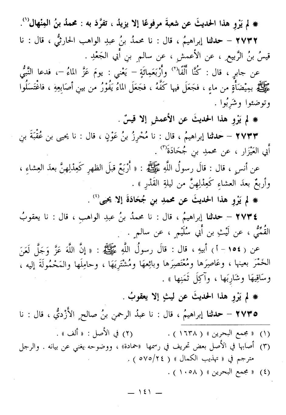 2734 - حَدَّثَنَا إِبْرَاهِيمُ قَالَ: نا مُحَمَّدُ بْنُ عَبْدِ الْوَاهِبِ قَالَ: نا يَعْقُوبُ الْقُمِّيُّ، عَنْ لَيْثِ بْنِ أَبِي سُلَيْمٍ، عَنْ سَالِمٍ، عَنْ أَبِيهِ قَالَ: قَالَ رَسُولُ اللَّهِ صَلَّى اللهُ عَلَيْهِ وَسَلَّمَ: «إِنَّ §اللَّهَ عَزَّ وَجَلَّ لَعَنَ الْخَمْرَ لِعَيْنِهَا، وَعَاصِرَهَا وَمُعْتَصِرَهَا وَبَائِعَهَا ومُشْتَرِيَهَا، وَحَامِلَهَا وَالْمَحْمُولَةَ إِلَيْهِ، وَسَاقِيَهَا وَشَارِبَهَا، وَآكِلَ ثَمَنِهَا»
