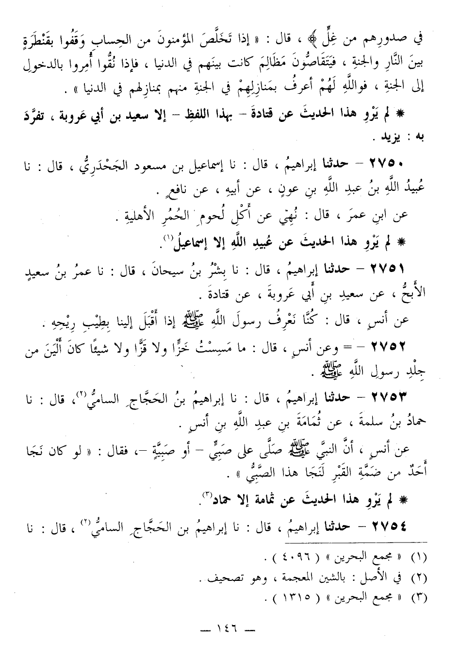 2751 - حَدَّثَنَا إِبْرَاهِيمُ قَالَ: نا بِشْرُ بْنُ سَيْحَانَ قَالَ: نا عُمَرُ بْنُ سَعِيدٍ الْأَبَحُّ، عَنْ سَعِيدِ بْنِ أَبِي عَرُوبَةَ، عَنْ قَتَادَةَ، عَنْ أَنَسٍ قَالَ: كُنَّا §نَعْرِفُ رَسُولَ اللَّهِ صَلَّى اللهُ عَلَيْهِ وَسَلَّمَ إِذَا أَقْبَلَ إِلَيْنَا بِطِيبِ رِيحِهِ "