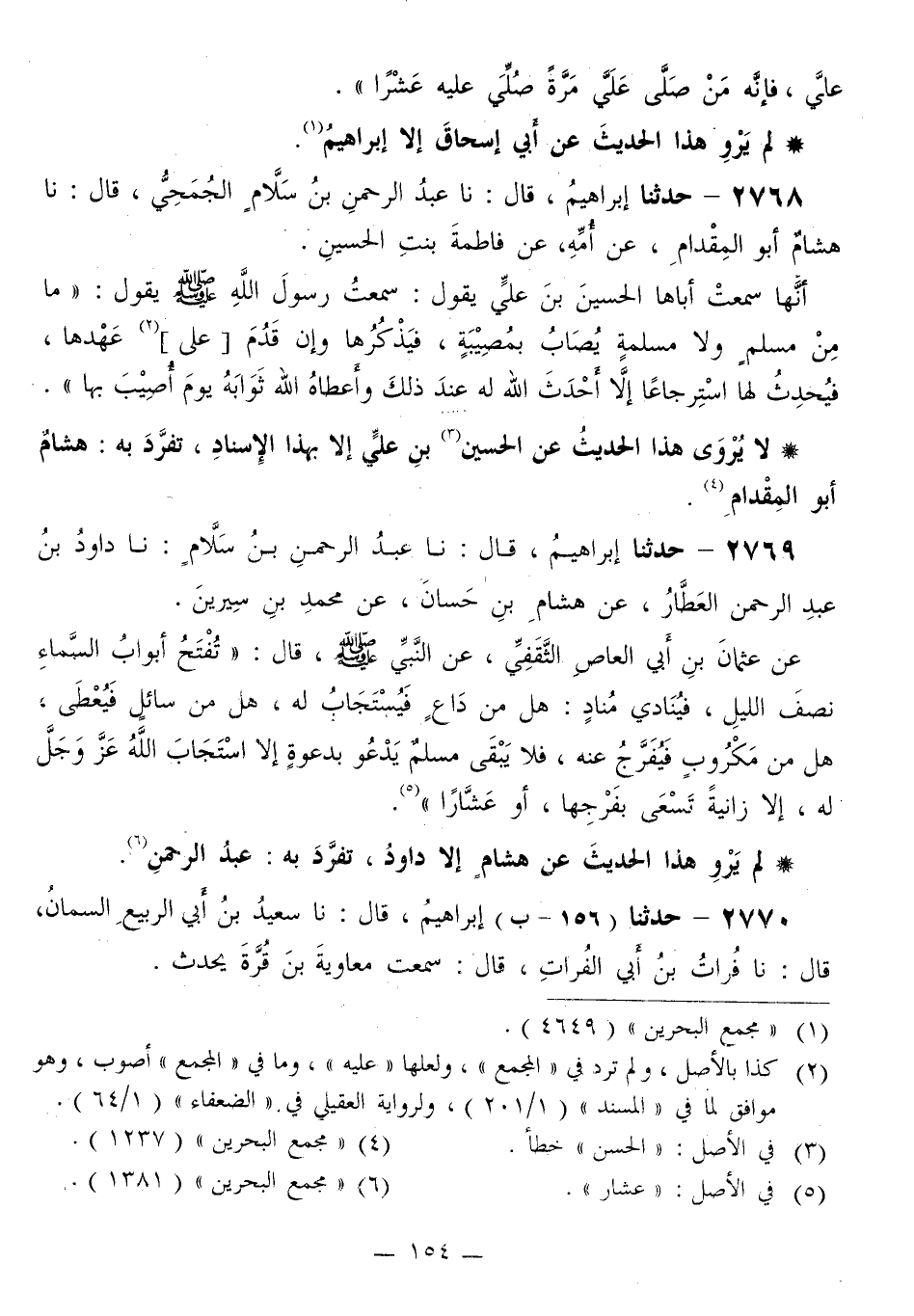 2768 - حَدَّثَنَا إِبْرَاهِيمُ قَالَ: نا عَبْدُ الرَّحْمَنِ بْنُ سَلَّامٍ الْجُمَحِيُّ قَالَ: نا هِشَامٌ أَبُو الْمِقْدَامِ، عَنْ أُمِّهِ، عَنْ فَاطِمَةَ بِنْتِ الْحُسَيْنِ، أَنَّهَا سَمِعَتْ أَبَاهَا الْحُسَيْنَ بْنَ عَلِيٍّ يَقُولُ: سَمِعْتُ رَسُولَ اللَّهِ صَلَّى اللهُ عَلَيْهِ وَسَلَّمَ يَقُولُ: «§مَا مِنْ مُسْلِمٍ وَلَا مُسْلِمَةٍ يُصَابُ بِمُصِيبَةٍ، فَيَذْكُرُهَا وَإِنْ قَدُمَ عَلَى عَهْدِهَا، فَيُحْدِثُ لَهَا اسْتِرْجَاعًا إِلَّا أَحْدَثَ اللَّهُ لَهُ عِنْدَ ذَلِكَ وَأَعْطَاهُ اللَّهُ ثَوَابَهُ يَوْمَ أُصِيبَ بِهَا»