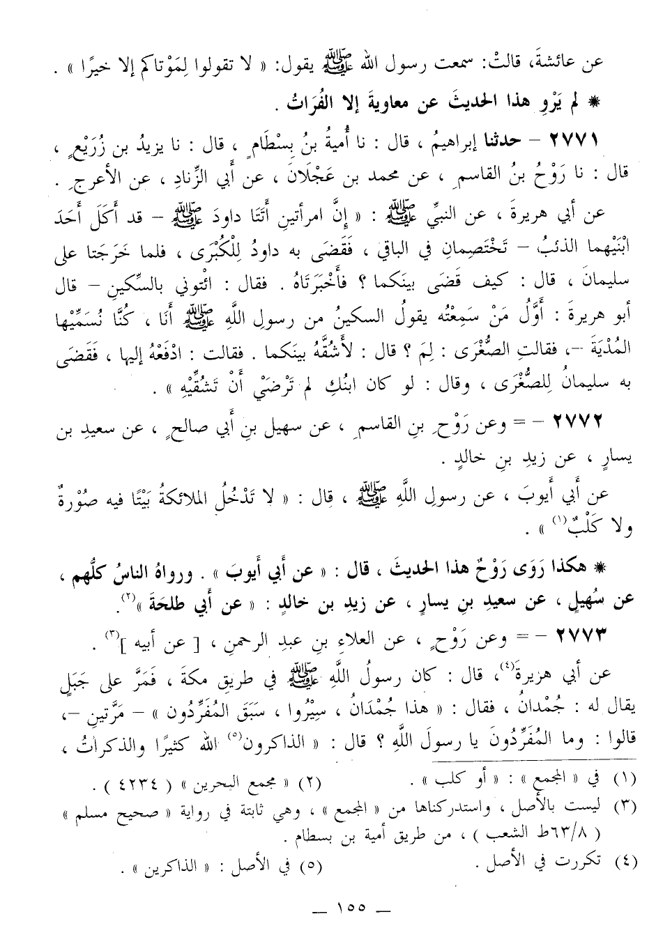 2772 - وَعَنْ رَوْحِ بْنِ الْقَاسِمِ، عَنْ سُهَيْلِ بْنِ أَبِي صَالِحٍ، عَنْ سَعِيدِ بْنِ يَسَارٍ، عَنْ زَيْدِ بْنِ خَالِدٍ، عَنْ أَبِي أَيُّوبَ، عَنْ رَسُولِ اللَّهِ صَلَّى اللهُ عَلَيْهِ وَسَلَّمَ قَالَ: «§لَا تَدْخُلُ الْمَلَائِكَةُ بَيْتًا فِيهِ صُورَةٌ وَلَا كَلْبٌ» هَكَذَا رَوَى رَوْحٌ هَذَا الْحَدِيثَ قَالَ: عَنْ أَبِي أَيُّوبَ وَرَوَاهُ النَّاسُ كُلُّهُمْ، عَنْ سُهَيْلٍ، عَنْ سَعِيدِ بْنِ يَسَارٍ، عَنْ زَيْدِ بْنِ خَالِدٍ، عَنْ أَبِي طَلْحَةَ