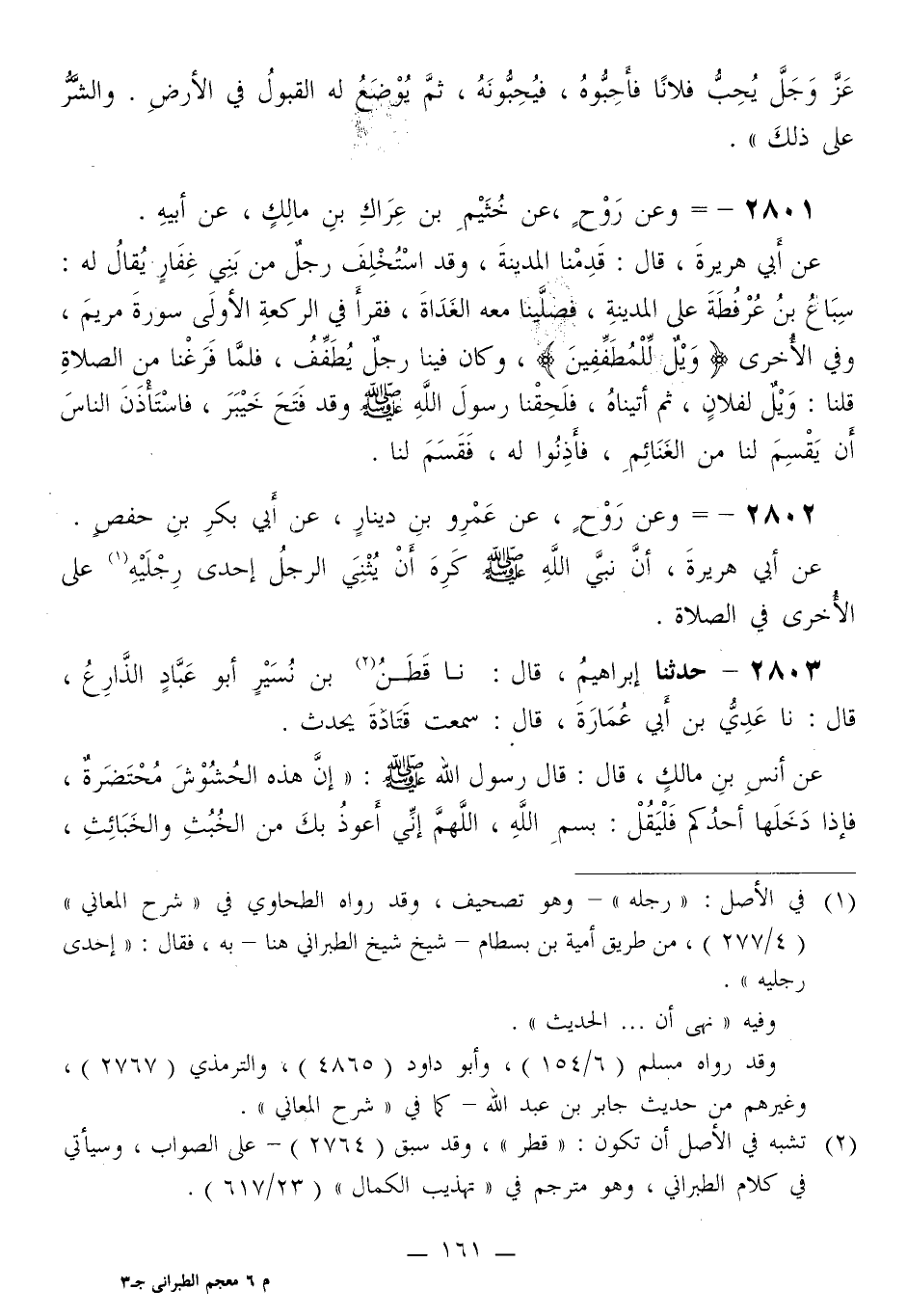 2801 - وَعَنْ رَوْحٍ، عَنْ خُثَيْمِ بْنِ عِرَاكِ بْنِ مَالِكٍ، عَنْ أَبِيهِ، عَنْ أَبِي هُرَيْرَةَ قَالَ: قَدِمْنَا الْمَدِينَةَ، وَقَدِ اسْتُخْلِفَ رَجُلٌ مِنْ بَنِي غِفَارٍ يُقَالُ لَهُ: سِبَاعُ بْنُ عُرْفُطَةَ عَلَى الْمَدِينَةِ، فَصَلَّيْنَا مَعَهُ الْغَدَاةَ، فَقَرَأَ فِي الرَّكْعَةِ الْأُولَى سُورَةَ مَرْيَمَ، وَفِي الْأُخْرَى وَيْلٌ لِلْمُطَفِّفِينَ، وَكَانَ فِينَا رَجُلٌ يُطَفِّفُ، فَلَمَّا فَرَغْنَا مِنَ الصَّلَاةِ قُلْنَا: وَيْلٌ لِفُلَانٍ، ثُمَّ أَتَيْنَاهُ، فَلَحِقْنَا رَسُولَ اللَّهِ صَلَّى اللهُ عَلَيْهِ وَسَلَّمَ وَقَدْ فَتَحَ خَيْبَرَ، فَاسْتَأْذَنَ النَّاسَ أَنْ «§يَقْسِمَ لَنَا مِنَ الْغَنَائِمِ، فَأَذِنُوا لَهُ، فَقَسَمَ لَنَا»