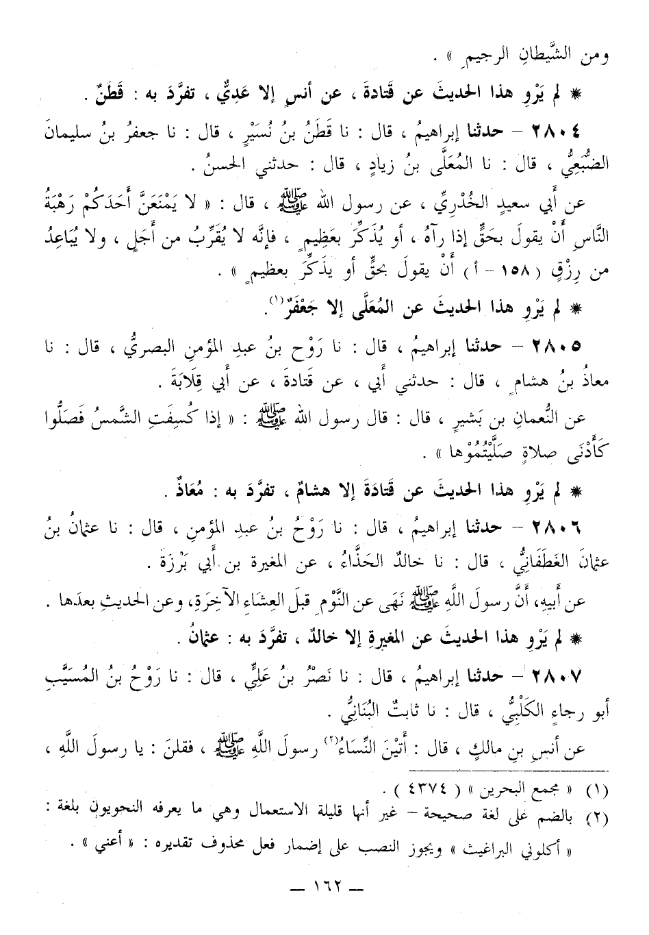 2804 - حَدَّثَنَا إِبْرَاهِيمُ قَالَ: نا قَطَنُ بْنُ نُسَيرٍ قَالَ: نا جَعْفَرُ بْنُ سُلَيْمَانَ الضُّبَعِيُّ قَالَ: نا الْمُعَلَّى بْنُ زِيَادٍ قَالَ: حَدَّثَنِي الْحَسَنُ، عَنْ أَبِي سَعِيدٍ الْخُدْرِيِّ، عَنْ رَسُولِ اللَّهِ صَلَّى اللهُ عَلَيْهِ وَسَلَّمَ قَالَ: «§لَا يَمْنَعَنَّ أَحَدَكُمْ رَهْبَةُ النَّاسِ أَنْ يَقُولَ بِحَقٍّ إِذَا رَآهُ، أَوْ يُذَكِّرَ بِعَظِيمٍ، فَإِنَّهُ لَا يُقَرِّبُ مِنْ أَجَلٍ، وَلَا يُبَاعِدُ مِنْ رِزْقٍ أَنْ يَقُولَ بِحَقٍّ أَوْ يُذَكِّرَ بِعَظِيمٍ»
