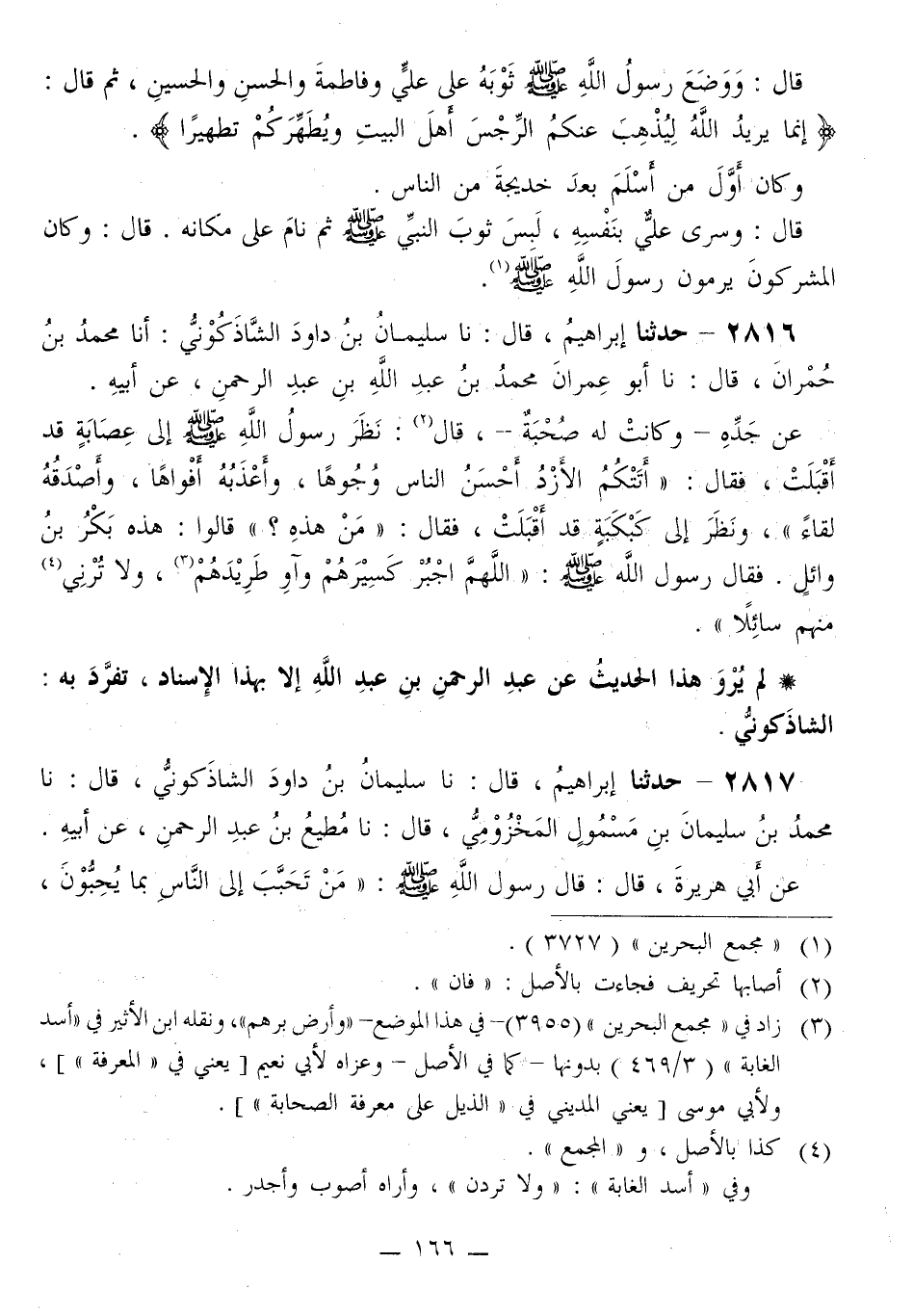 2816 - حَدَّثَنَا إِبْرَاهِيمُ قَالَ: نا سُلَيْمَانُ بْنُ دَاوُدَ الشَّاذَكُونِيُّ، أَنَا مُحَمَّدُ بْنُ حُمْرَانَ قَالَ: نا أَبُو عِمْرَانَ مُحَمَّدُ بْنُ عَبْدِ اللَّهِ بْنِ عَبْدِ الرَّحْمَنِ، عَنْ أَبِيهِ، عَنْ جَدِّهِ، وَكَانَتْ لَهُ صُحْبَةٌ قَالَ: نَظَرَ رَسُولُ اللَّهِ صَلَّى اللهُ عَلَيْهِ وَسَلَّمَ إِلَى عِصَابَةٍ قَدْ أَقْبَلَتْ، فَقَالَ: «§أَتَتْكُمُ الْأَزْدُ أَحْسَنُ النَّاسِ وُجُوهًا، وأَعْذَبُهُ أَفْوَاهًا، وأَصْدَقُهُ لِقَاءً» وَنَظَرَ إِلَى كَبْكَبَةٍ قَدْ أَقْبَلَتْ، فَقَالَ: «مَنْ هَذِهِ؟» قَالُوا: هَذِهِ بَكْرُ بْنُ وَائِلٍ، فَقَالَ رَسُولُ اللَّهِ صَلَّى اللهُ عَلَيْهِ وَسَلَّمَ: «اللَّهُمَّ اجْبُرْ كَسِيرَهُمْ وآوِ طَرِيدَهُمْ، وَلَا تُرِنِي مِنْهُمْ سَائِلًا»