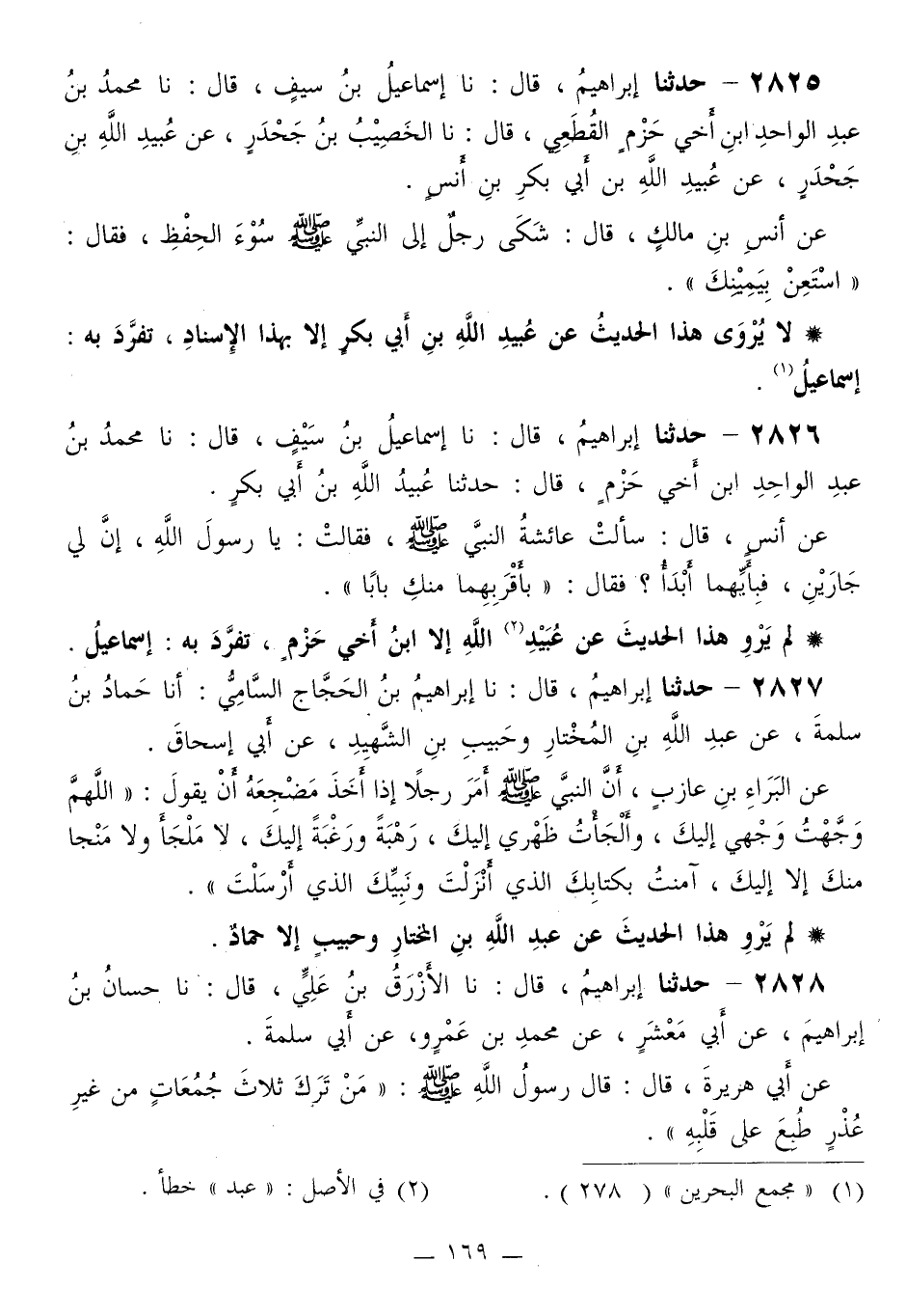 2827 - حَدَّثَنَا إِبْرَاهِيمُ قَالَ: نا إِبْرَاهِيمُ بْنُ الْحَجَّاجِ السَّامِيُّ، أَنَا حَمَّادُ بْنُ سَلَمَةَ، عَنْ عَبْدِ اللَّهِ بْنِ الْمُخْتَارِ، وَحَبِيبِ بْنِ الشَّهِيدِ، عَنْ أَبِي إِسْحَاقَ، عَنِ الْبَرَاءِ بْنِ عَازِبٍ، أَنَّ النَّبِيَّ صَلَّى اللهُ عَلَيْهِ وَسَلَّمَ أَمَرَ رَجُلًا إِذَا أَخَذَ مَضْجَعَهُ أَنْ يَقُولَ: «§اللَّهُمَّ وَجَّهْتُ وَجْهِي إِلَيْكَ، وَأَلْجَأْتُ ظَهْرِي إِلَيْكَ، رَهْبَةً وَرَغْبَةً إِلَيْكَ، لَا مَلْجَأَ وَلَا مَنْجَا مِنْكَ إِلَّا إِلَيْكَ، آمَنْتُ بِكِتَابِكَ الَّذِي أَنْزَلْتَ وَنَبِيِّكَ الَّذِي أَرْسَلْتَ»