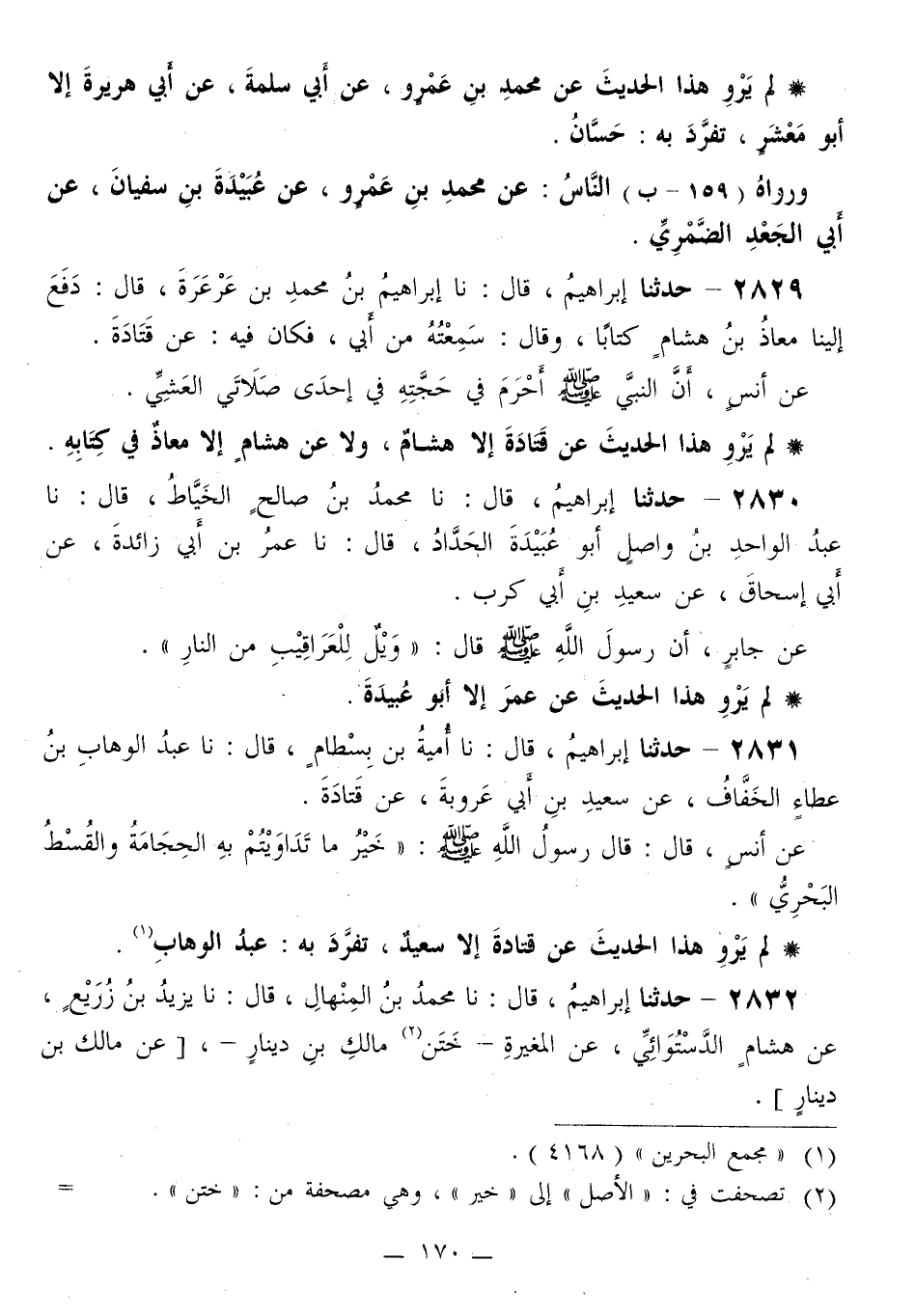 2829 - حَدَّثَنَا إِبْرَاهِيمُ قَالَ: نا إِبْرَاهِيمُ بْنُ مُحَمَّدِ بْنِ عَرْعَرَةَ قَالَ: دَفَعَ إِلَيْنَا مُعَاذُ بْنُ هِشَامٍ، كِتَابًا، وَقَالَ: سَمِعْتُهُ مِنْ أَبِي فَكَانَ فِيهِ: عَنْ قَتَادَةَ، عَنْ أَنَسٍ «أَنَّ النَّبِيَّ صَلَّى اللهُ عَلَيْهِ وَسَلَّمَ §أَحْرَمَ فِي حَجَّتِهِ فِي إِحْدَى صَلَاتَيِ الْعَشِيِّ»
